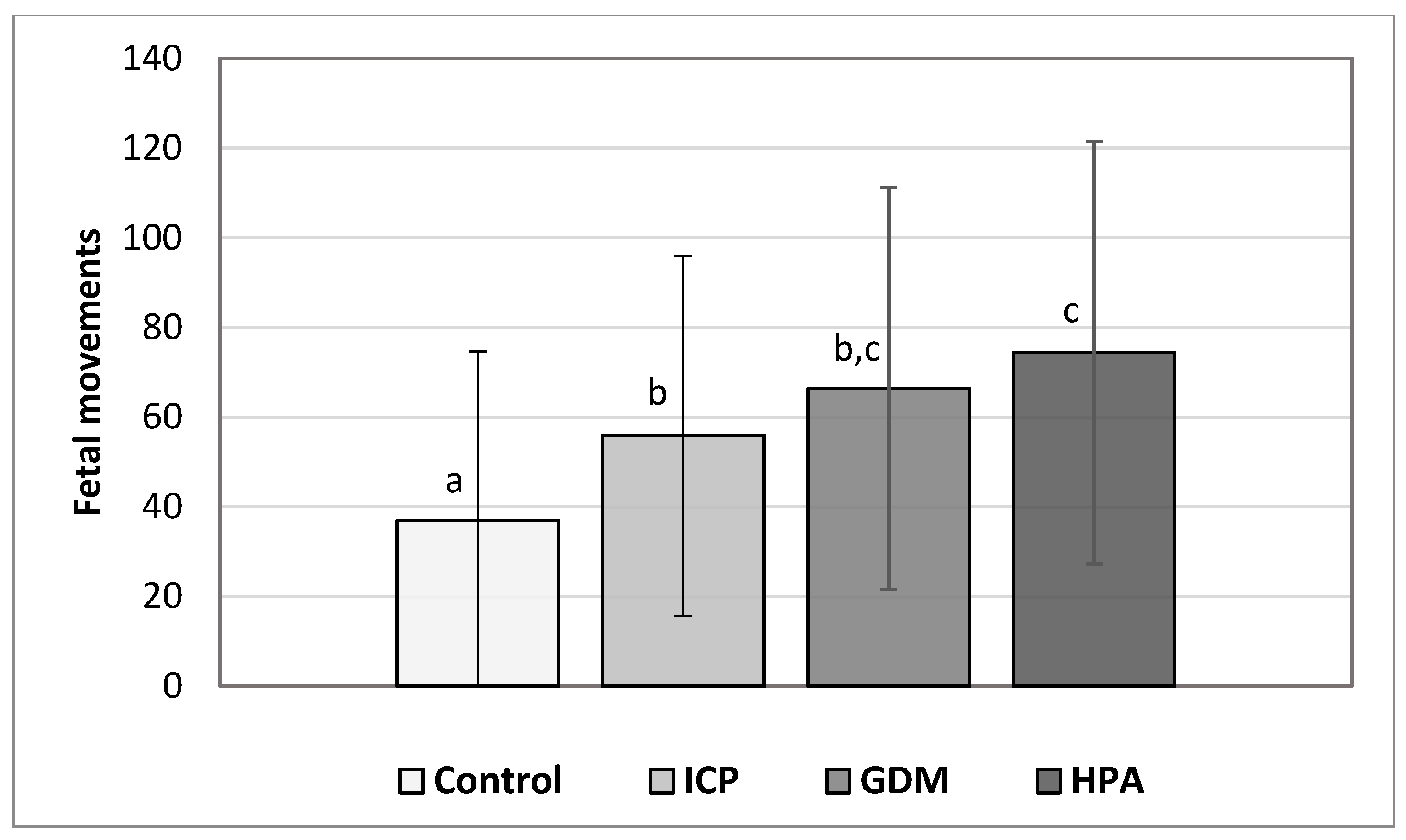 Figure 1). Mean counts increased progressively from 37.0 in the control group to 55.9 in ICP, 66.4 in GDM, and 74.5 in HDP pregnancies, with median values showing the same pattern. Variability was high across all cohorts (COV > 60%), reflecting physiological fluctuations related to behavioral-state cycling and intrinsic movement variability.
