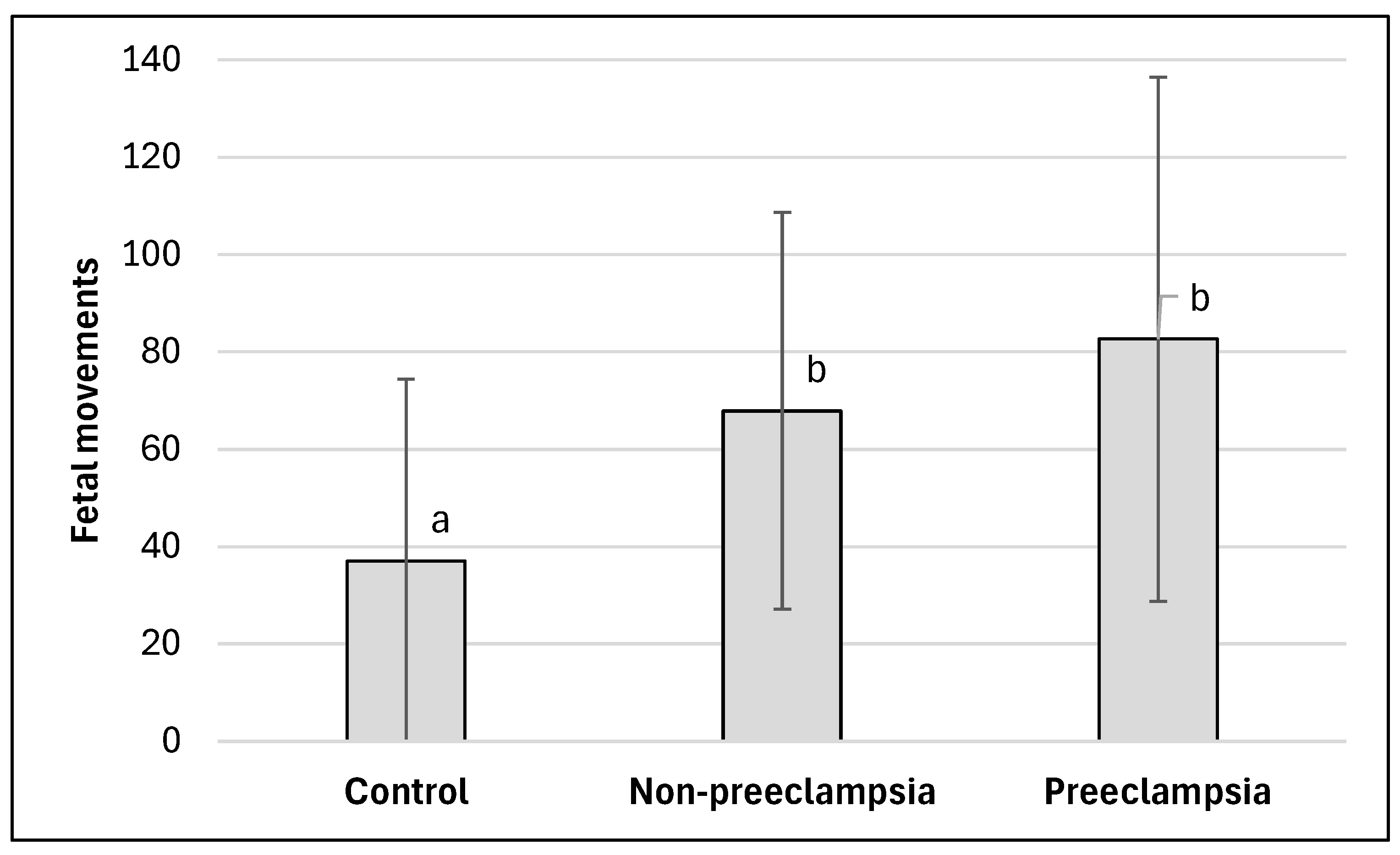 Taken together, these findings suggest that increased maternally perceived fetal movements in high-risk pregnancies should be interpreted within the broader physiological and clinical context, particularly when accompanied by altered variability or reduced acceleratory responses. They should not be considered in isolation, as elevated movement frequency may represent an early and currently underrecognized sign of intrauterine stress in certain pathological states. Further research integrating both maternal perception and objective movement assessment is needed to clarify the mechanisms underlying this pattern and to determine whether such movement profiles possess predictive value for fetal adaptation or subsequent neonatal outcomes.