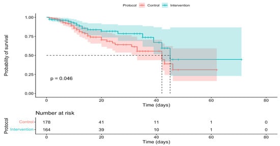 When comparing the study groups, no significant differences were found in age, sex, the number of patients with septic shock, or the number of patients with sepsis. No differences were found in lactate levels or SOFA scores between the intervention and control groups. Likewise, no differences were documented in the number of comorbidities between the patients in the compared groups. Finally, the most frequent site of origin of sepsis was pulmonary, followed by urinary, with no differences documented between the foci of infection and the compared groups (Table 1).
