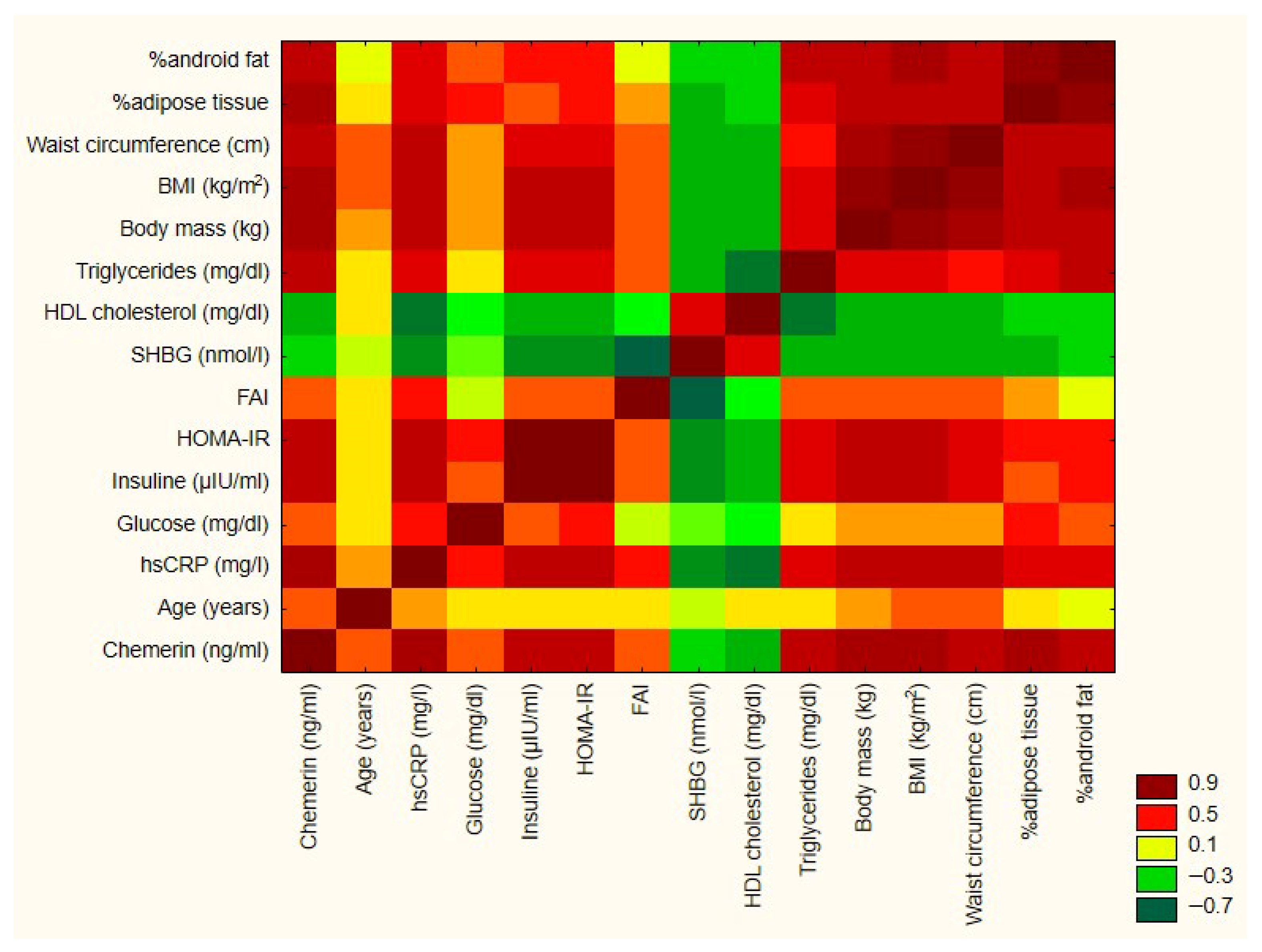 - Kort, D.H.; Kostolias, A.; Sullivan, C.; Lobo, R.A. Chemerin as a marker of body fat and insulin resistance in women with polycystic ovary syndrome. Gynecol. Endocrinol. 2015, 31, 152–155. [Google Scholar] [CrossRef] [PubMed]