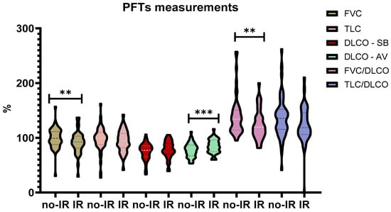 PFTs measurements comparison. Abbreviations: PFTs = Pulmonary Function Tests, % = percentages, no-IR = Non-Insulin Resistance, IR = Insulin Resistance, FVC = Forced Vital Capacity, TLC = Total Lung Capacity, DLCO = Diffusing Lung Capacity of Carbon Monoxide. ** = p < 0.01, *** = p < 0.001.