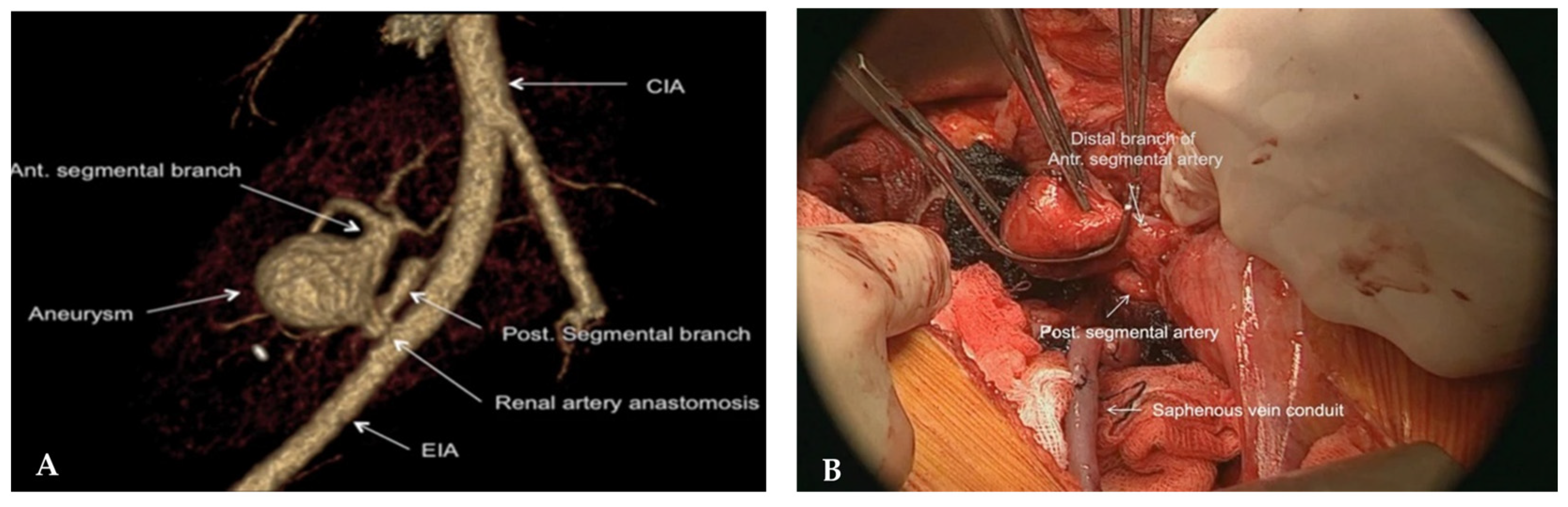 - Maritati, F.; Pini, R.; Comai, G.; Bini, C.; Corradetti, V.; Mattiotti, M.; Ravaioli, M.; Pini, A.; La Manna, G.; Gargiulo, M. Anastomotic Pseudoaneurysm in Kidney Transplant: A Challenging Management for a Rare Entity. J. Endovasc. Ther. 2024, 31, 140–145. [Google Scholar] [CrossRef]