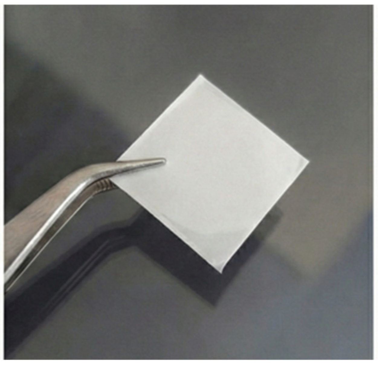 v (Honeywell, Charlotte, NC, USA) and glycerol 85% (Fagron, Kraków, Poland) with the addition of sorbitol (70% m/m aqueous solution, Sigma-Aldrich, Saint Louis, MO, USA). To ensure complete polymer hydration and homogenization in solvent the mixture was heated in an autoclave at 80 °C for 60 min. Immediately after thermal treatment the hot gel was degassed under vacuum to eliminate air bubbles that could compromise the structural integrity of the film. Upon gel cooling, the capsaicin was incorporated by mixing 10 g of the base gel with 1.5 mL of an ethanolic capsaicin solution (1 mg/mL) to ensure uniform drug content. Next, the gel containing the active substance was covered with a protective liner and spread to a thickness of 0.3 mm, then left to dry. Both layers were joined after drying by heating the protective layer and placing the mucoadhesive layer on top of it, which completed the process of manufacturing the two-layer system. The publication does not specify the quantitative composition due to the ongoing process of preparing a patent application. The bilayer polymer-film after drying is depicted in