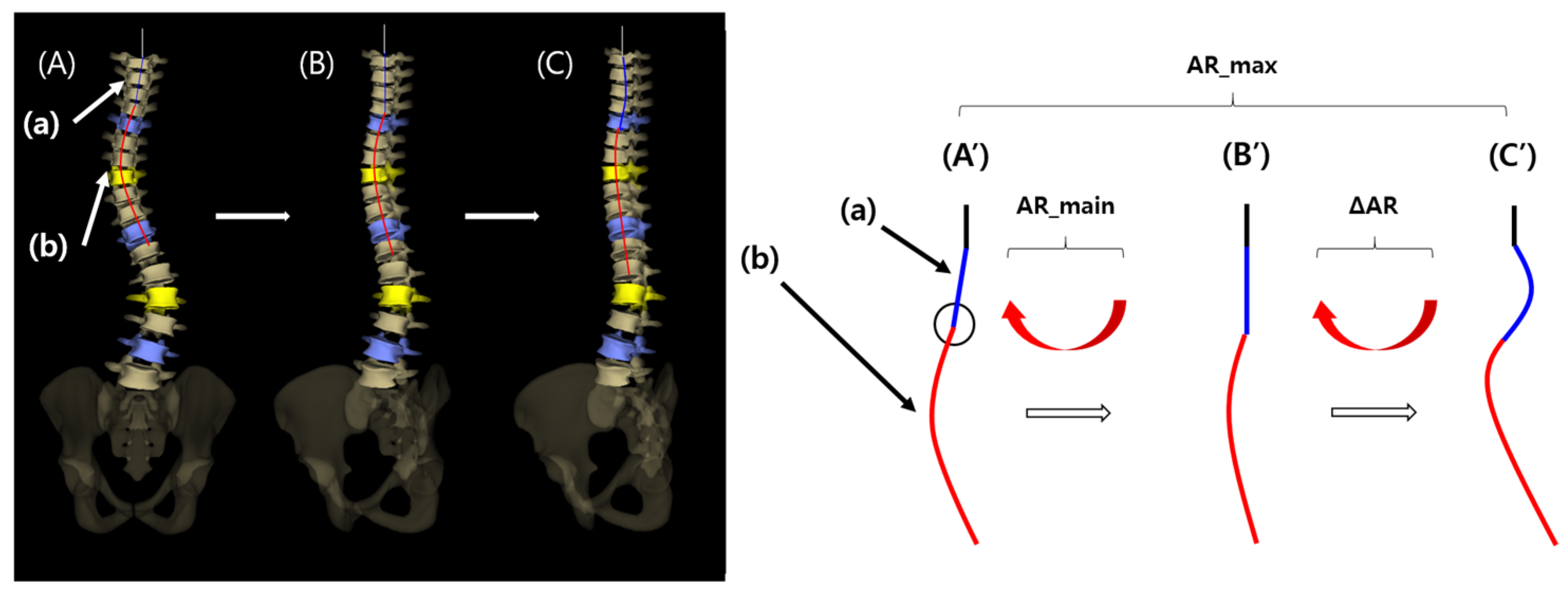 AR_main and AR_max were evaluated to verify the presence of main (a) and minor curves (b). If AR_max is greater than AR_main (ΔAR > 0), a minor curve (b) is present, indicating that direct lateral bending has contributed to the scoliosis development. Additionally, if lateral bending (the presence of a minor curve) is the only factor contributing to scoliosis development, a visible main curve would be lacking, and AR_main would be equal to zero (