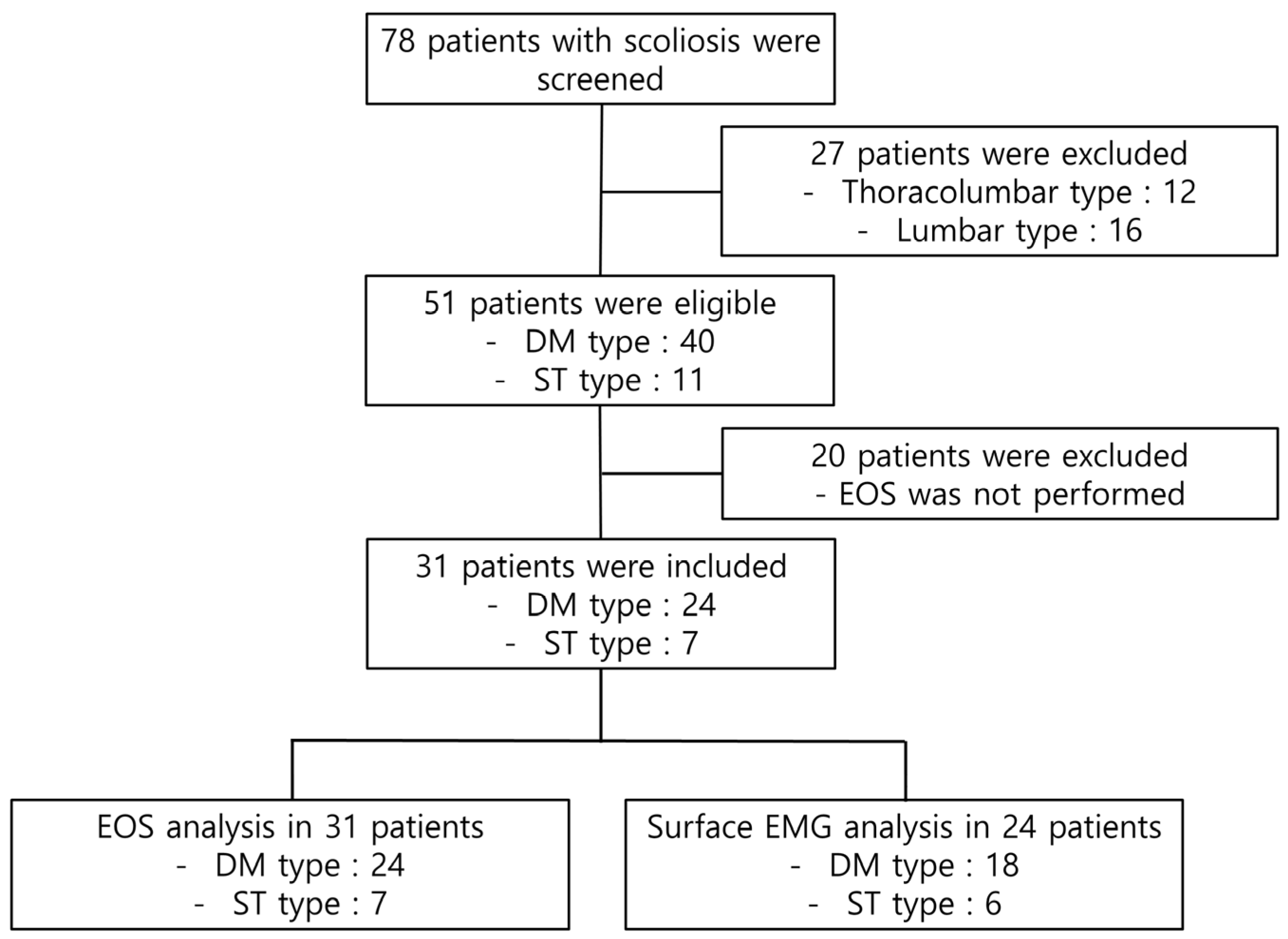 A total of 78 patients with IS underwent screening. Of these, 47 patients were excluded based on the scoliosis type (thoracolumbar or lumbar type) or the absence of EOS data. Finally, a total of 31 patients were included in the EOS analysis and 24 patients were included in the EMG analysis (