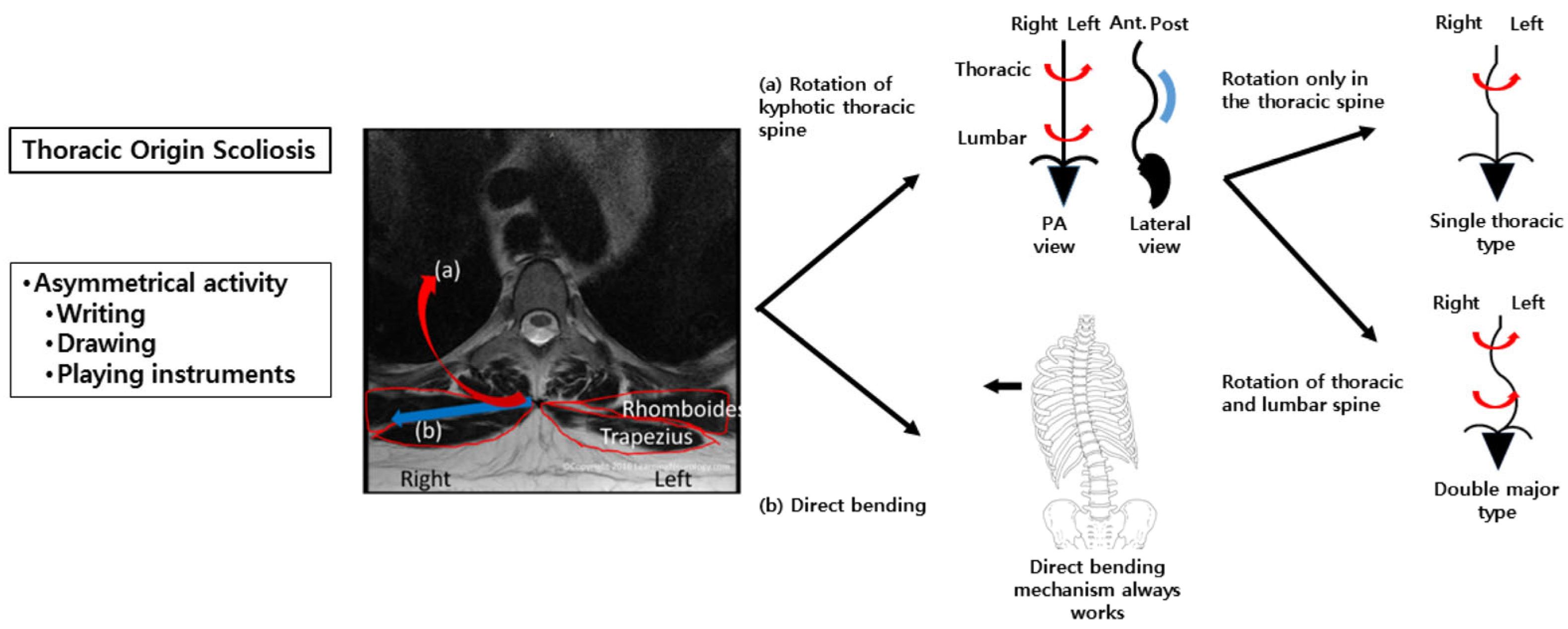 4]. AIS presents with heterogeneous curve patterns. According to previous classifications, double major (DM) and single thoracic (ST) curves—collectively referred to as thoracic-origin curve patterns—are thought to be associated with asymmetric contractions of the paraspinal muscles surrounding the thoracic spine. In contrast, thoracolumbar and lumbar-type curves appear to have different underlying mechanisms [