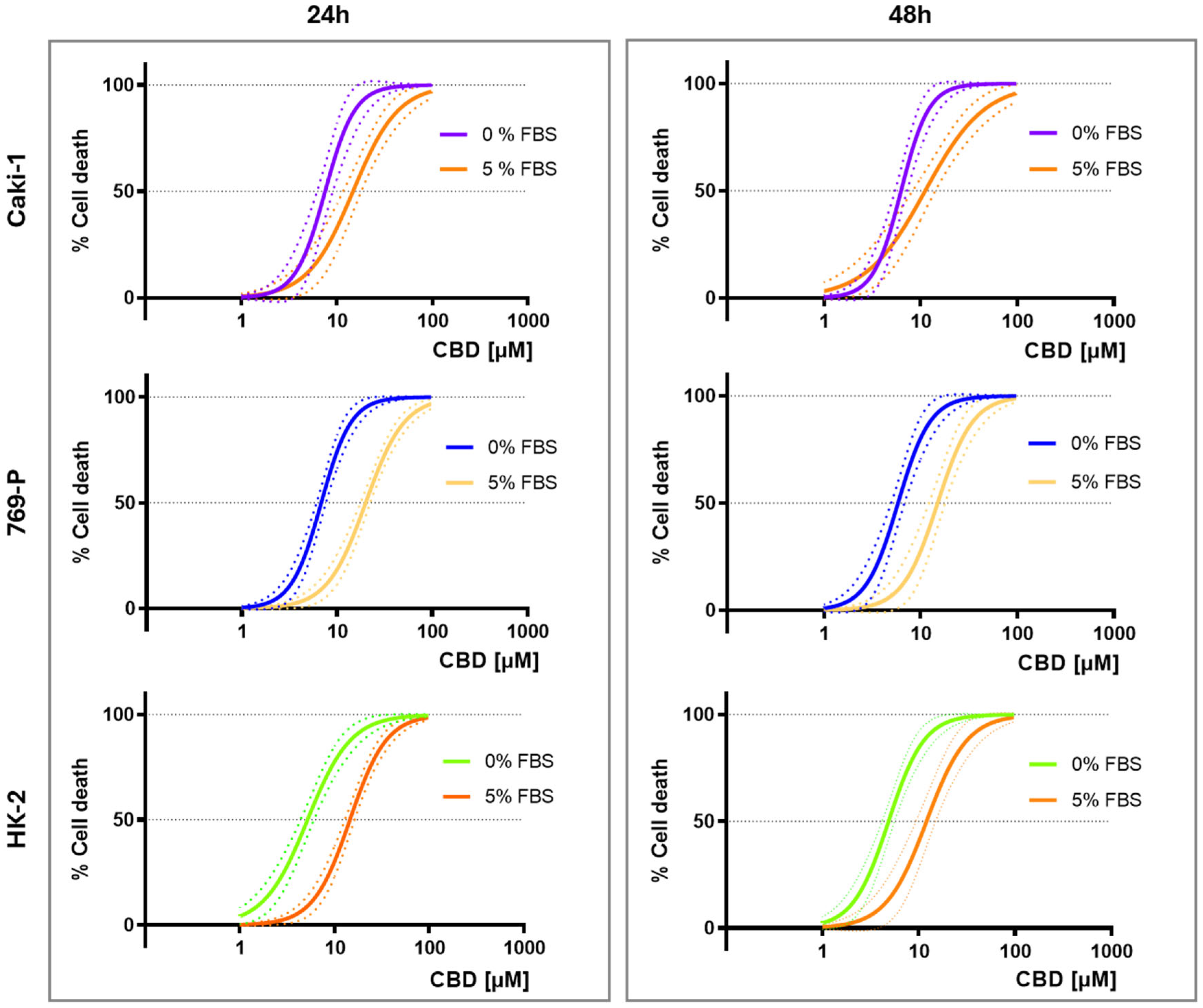 - Sainz-Cort, A.; Müller-Sánchez, C.; Espel, E. Anti-proliferative and cytotoxic effect of cannabidiol on human cancer cell lines in presence of serum. BMC Res. Notes 2020, 13, 389. [Google Scholar] [CrossRef]