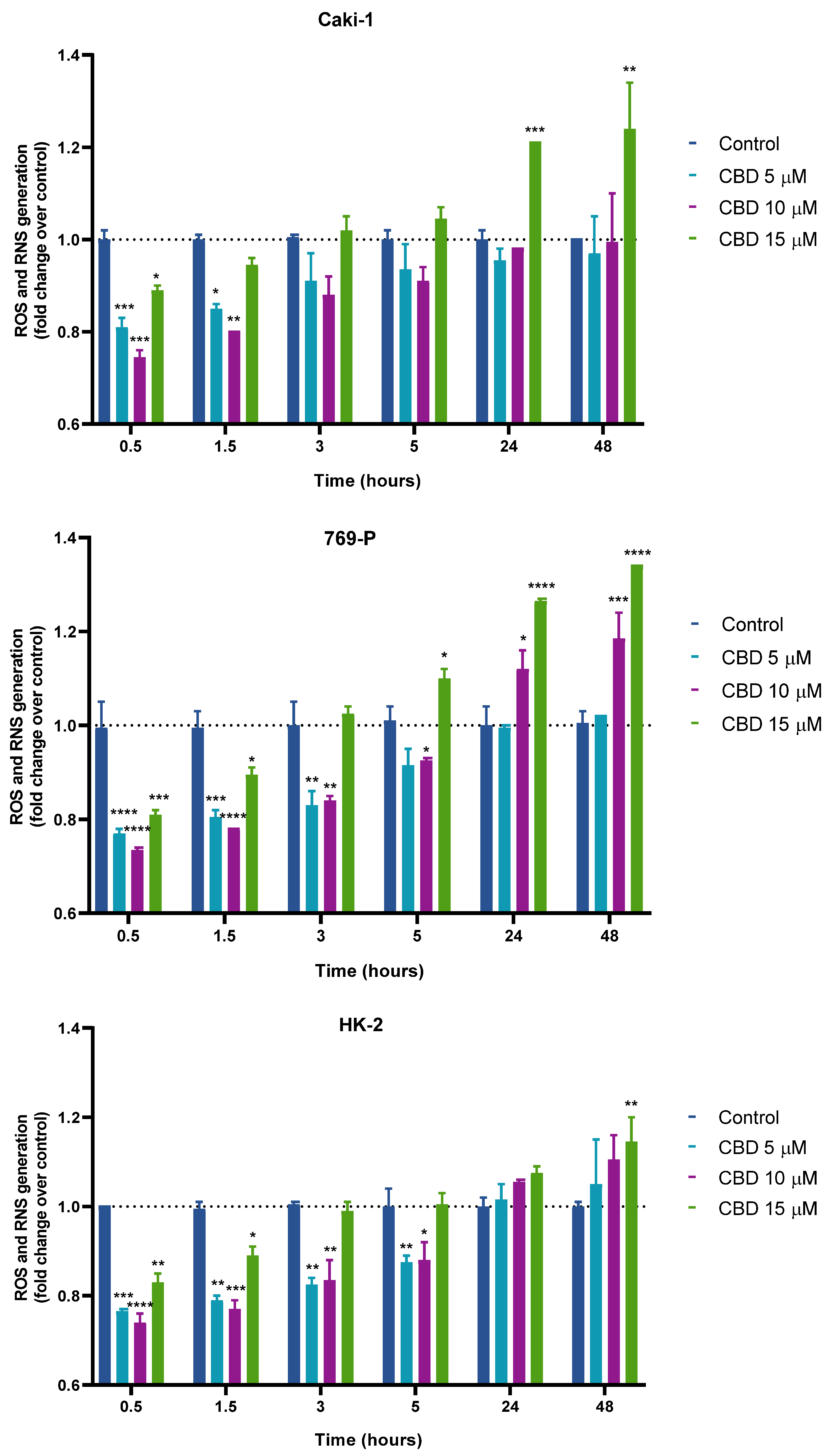 3.3. CBD Induces Biphasic, Time-Dependent Effects on Intracellular ROS/RNS Levels