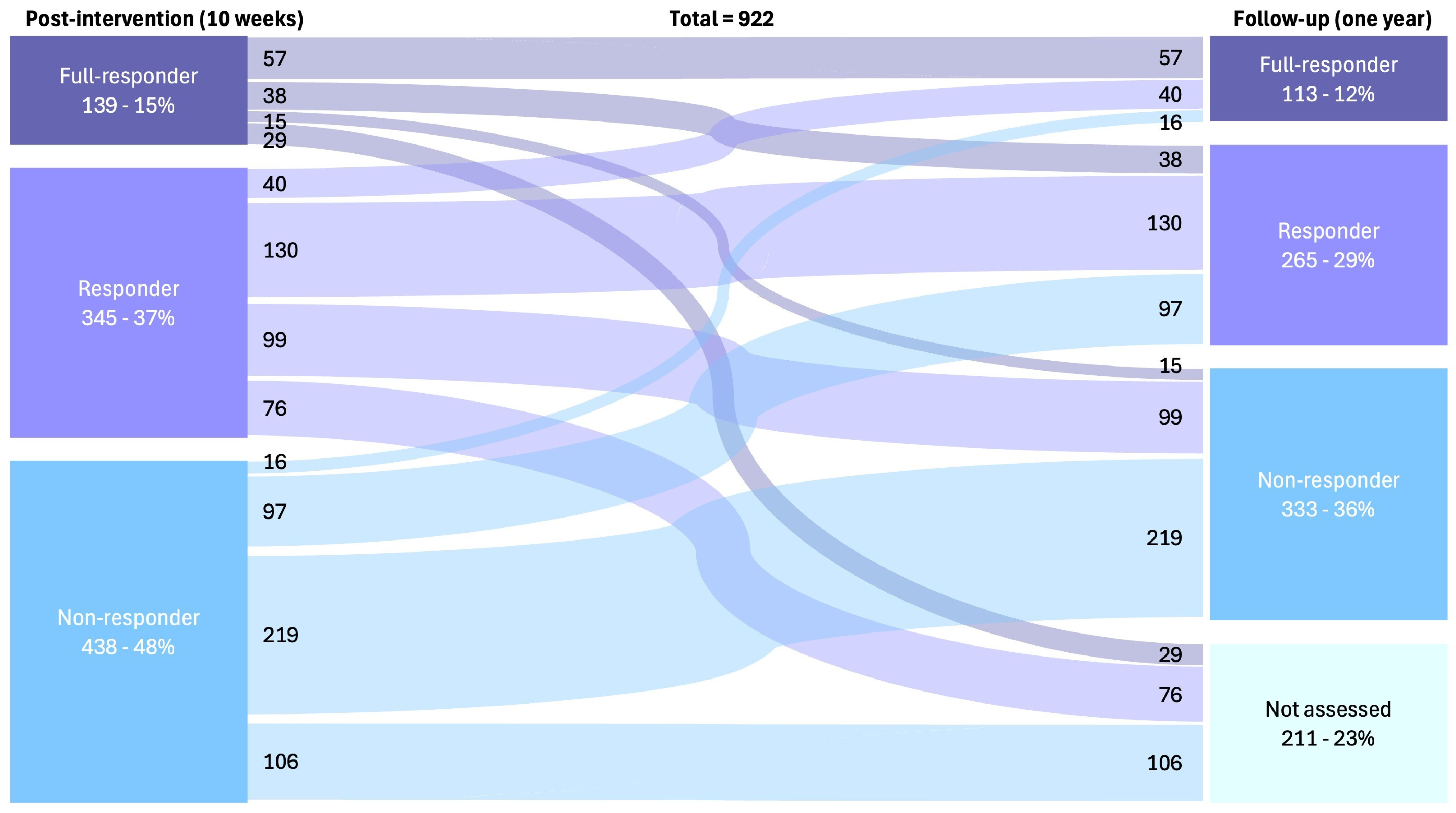 | Variables (n) | Baseline Characteristics Total Population (n = 922) | Response After 10 Weeks | Response After One Year | ||||