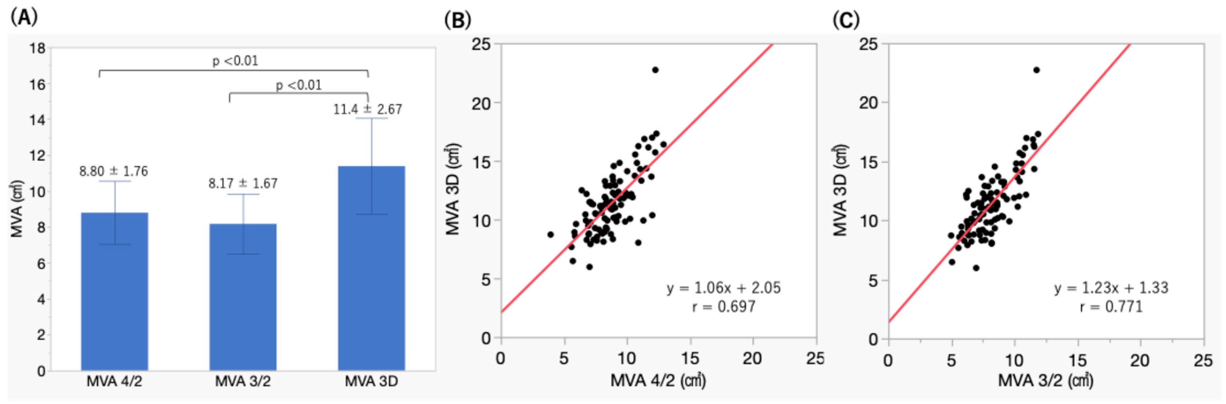 - Hyodo, E.; Iwata, S.; Tugcu, A.; Oe, Y.; Koczo, A.; Shimada, K.; Muro, T.; Yoshikawa, J.; Yoshiyama, M.; Gillam, L.D.; et al. Accurate measurement of mitral annular area by using single and biplane linear measurements: Comparison of conventional methods with the three-dimensional planimetric method. Eur. Heart J. Cardiovasc. Imaging 2012, 13, 605–611. [Google Scholar] [CrossRef] [PubMed]