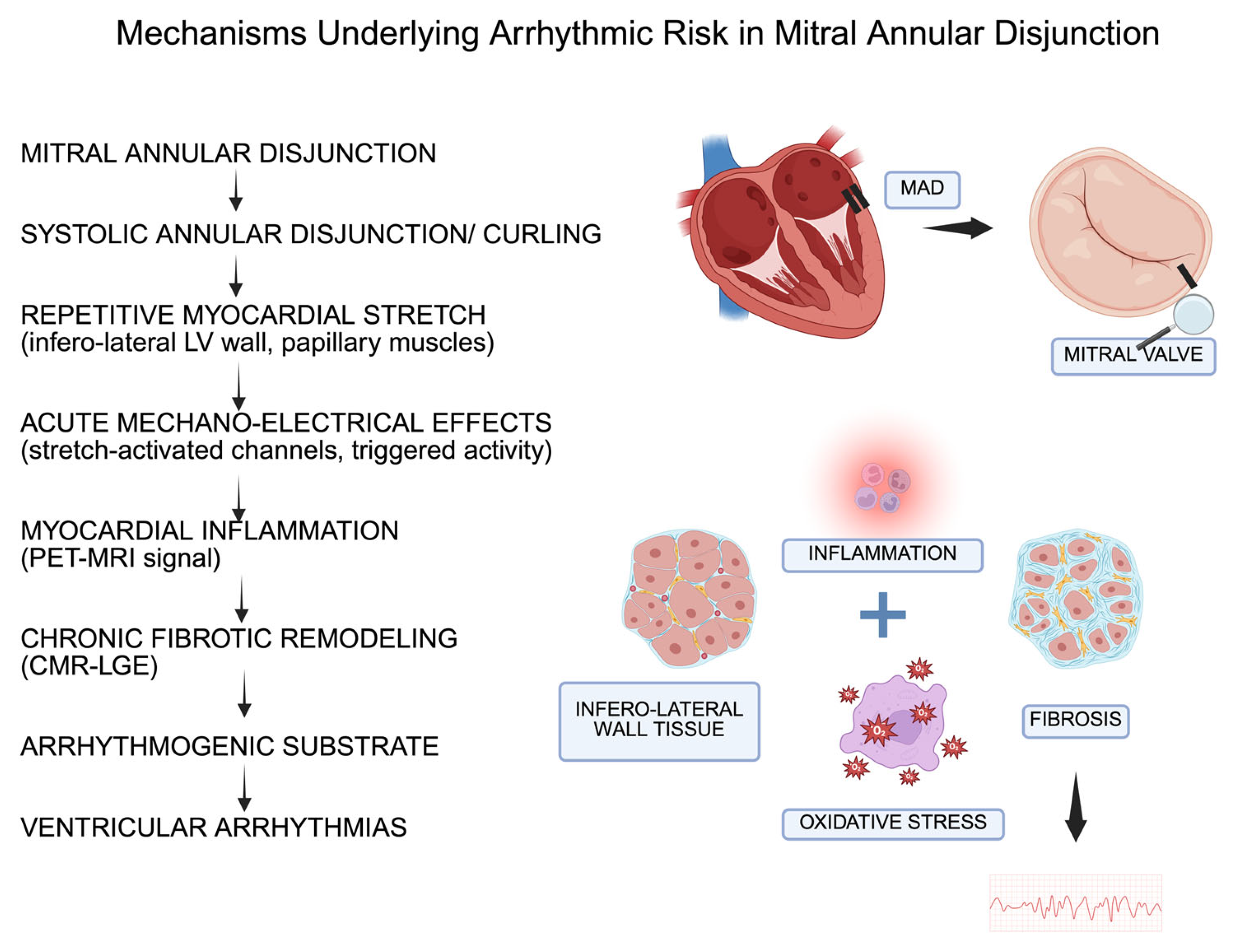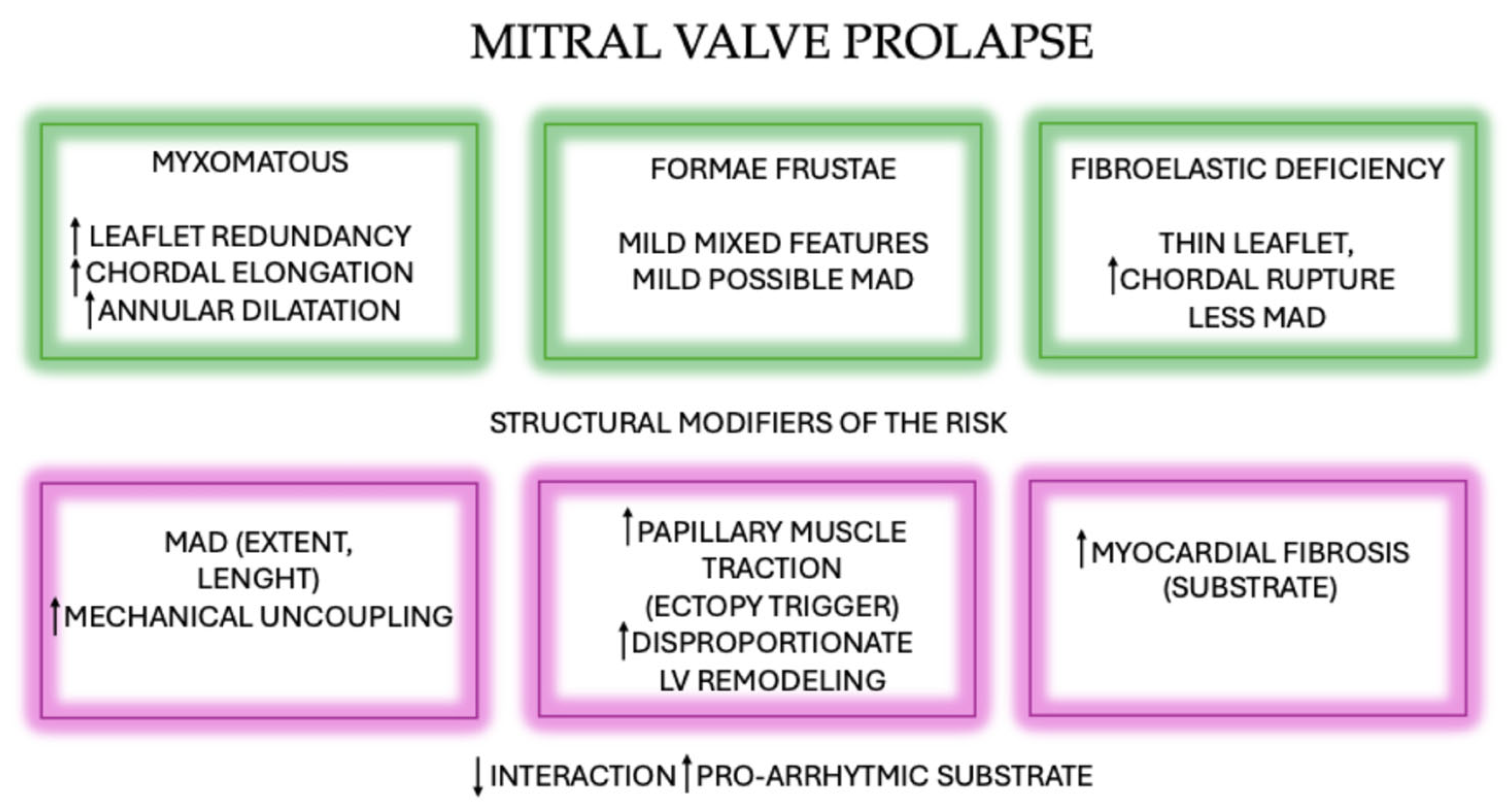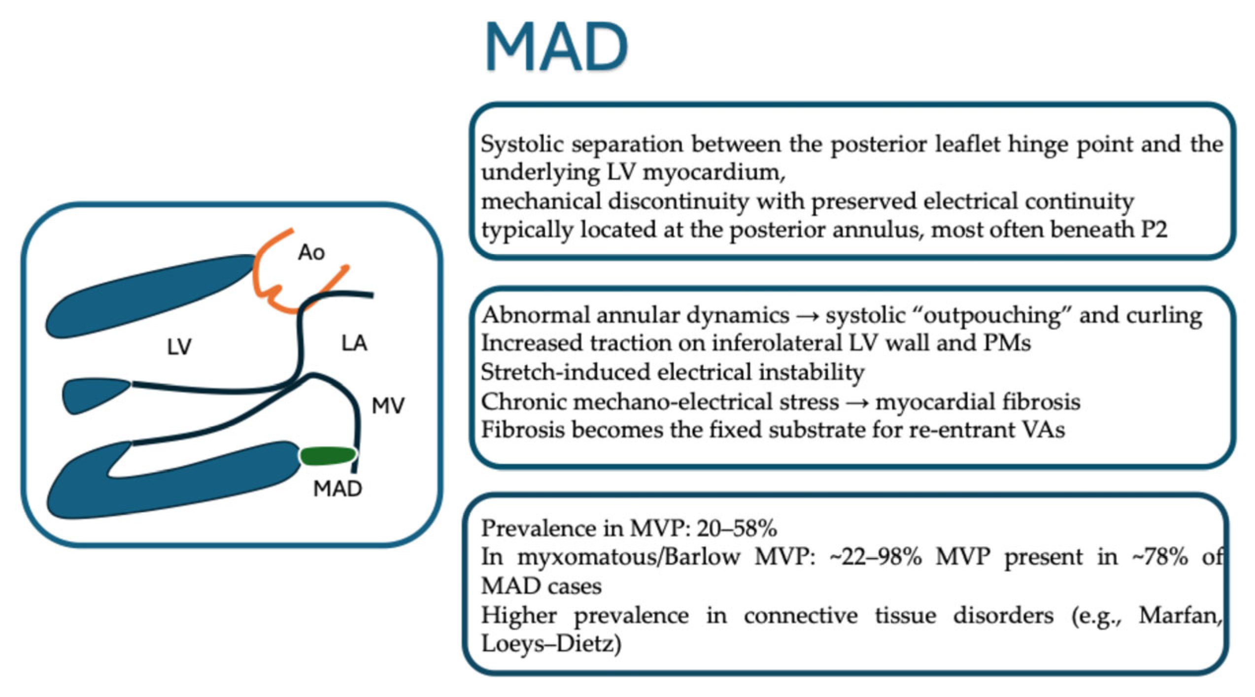 | Pathophysiological implications | Greater longitudinal MAD extent → increased curling, inferolateral systolic outpouching Mechanical stretch Triggering of pro-fibrotic molecular pathways → arrhythmogenic substrate | [10,15,24,25] |