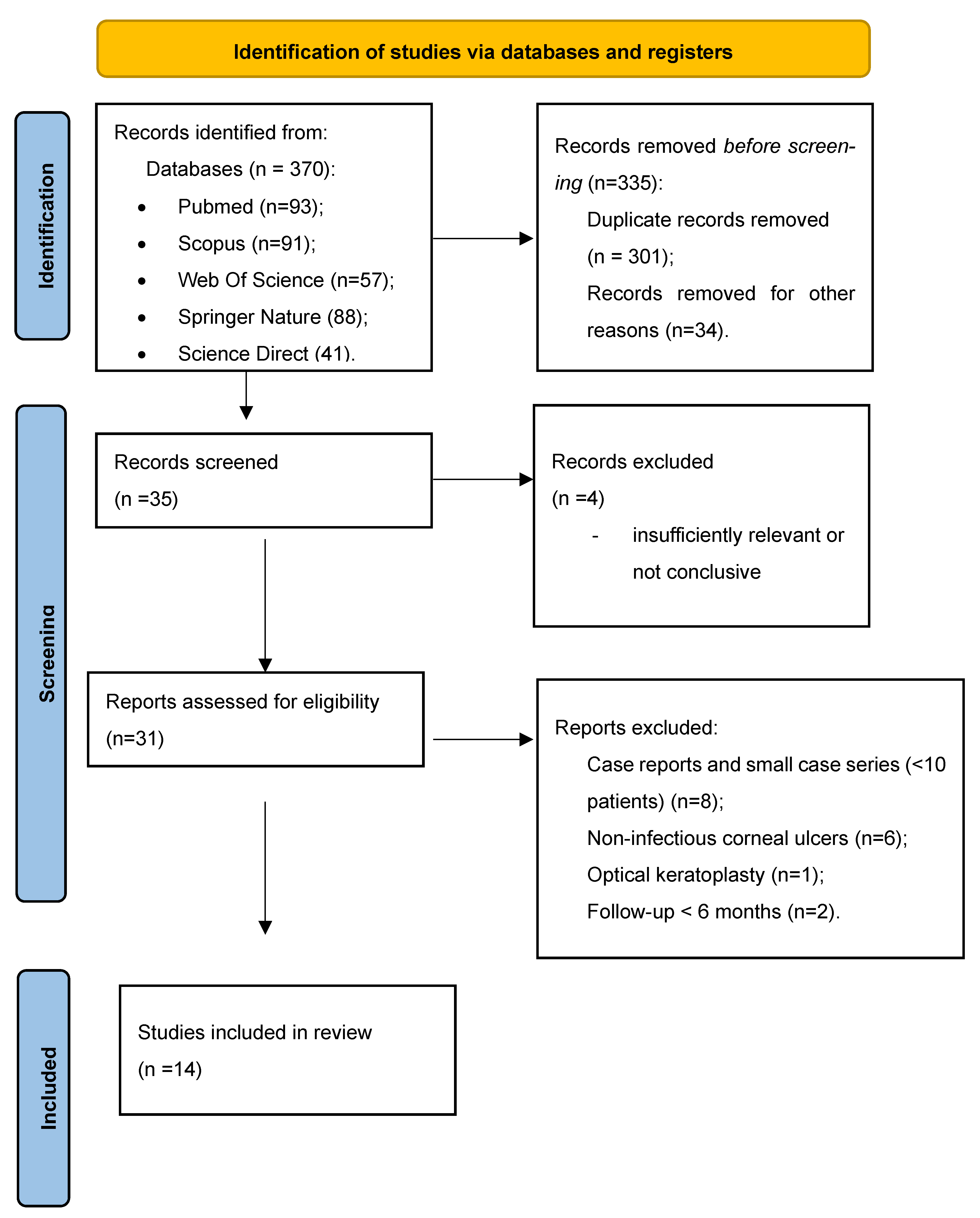 | Bajracharya, 2015 [14] | Nepal | 180 | Bacterial (28%), fungal (28%), unknown (44%) | TPK | 29 ± 23 | Infection control, graft clarity, anatomical success, visual acuity |