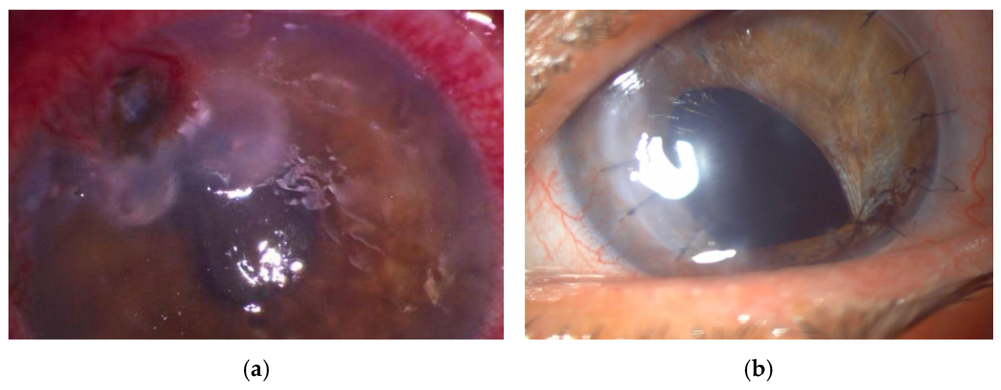 - Kasım, B.; Koçluk, Y. Long-term outcomes of therapeutic penetrating keratoplasty for microbial keratitis in a tertiary care center in Turkey. Int. Ophthalmol. 2020, 40, 3513–3519. [Google Scholar] [CrossRef]