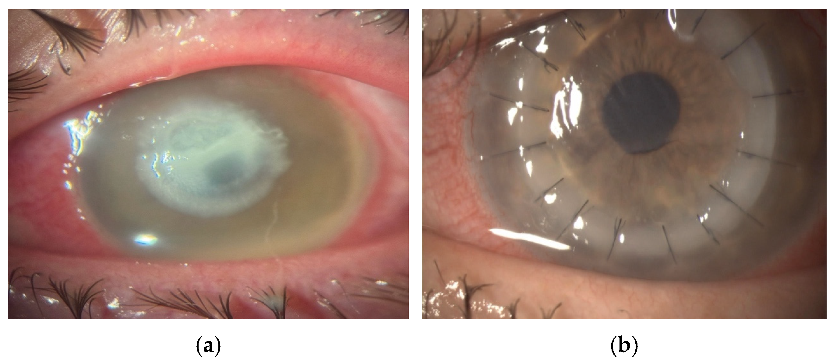- Przybek-Skrzypecka, J.; Ryk-Adamska, M.; Skrzypecki, J.; Izdebska, J.; Udziela, M.; Major, J.; Szaflik, J.P. Outcomes of Post-Keratoplasty Microbial Keratitis: A 16-Year Analysis. J. Clin. Med. 2025, 14, 3165. [Google Scholar] [CrossRef]