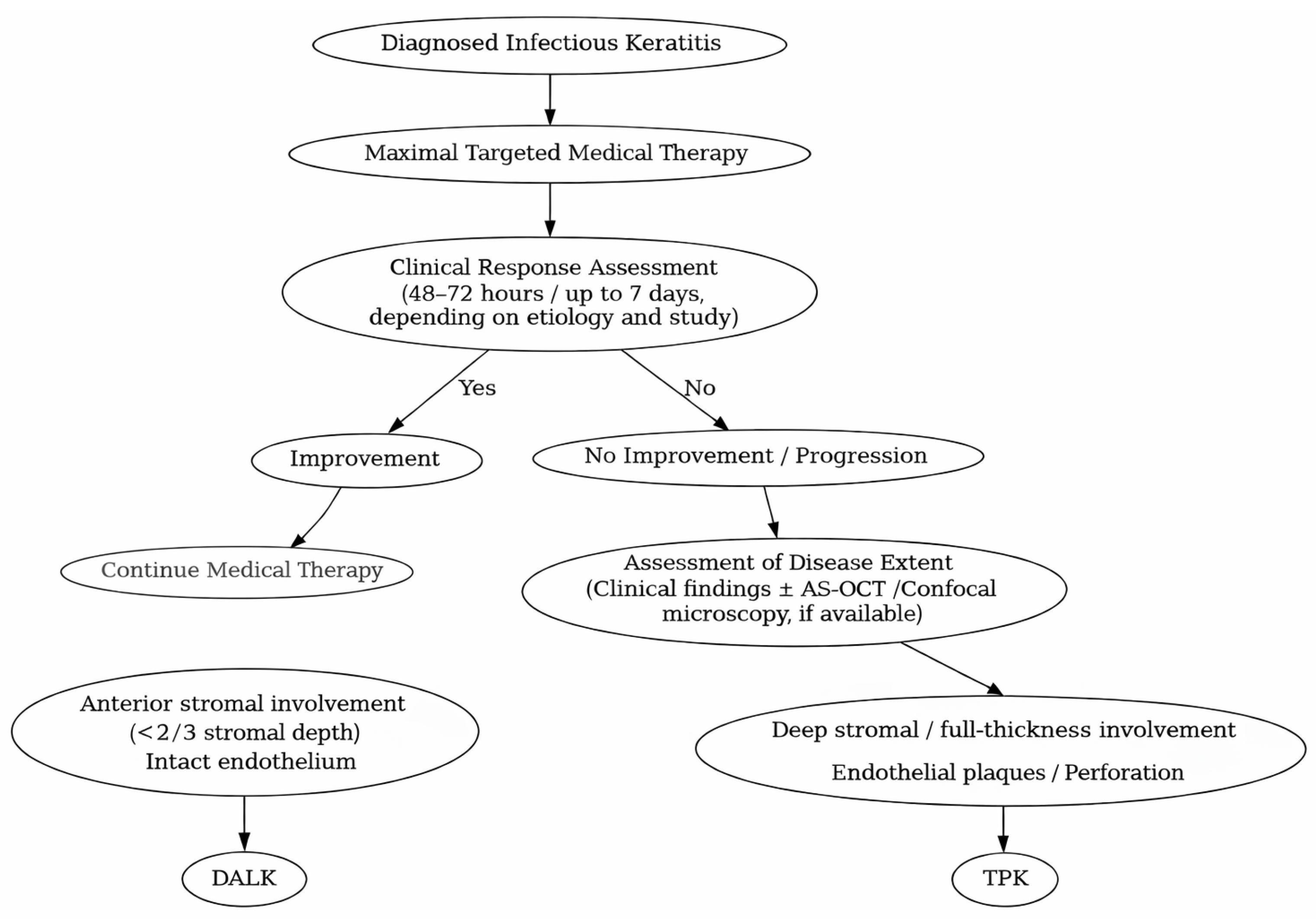 | Wang YC et al., 2023 [23] | China | 10 | Fungal (100%) | Two-step: flap + DALK | 9.25 ± 3.39 | Graft survival, infection control, visual acuity |