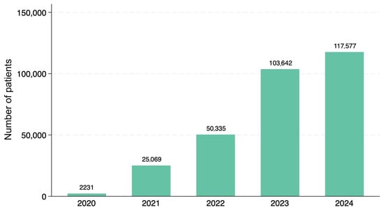 The total number of treatment sessions increased steadily over the study period. Table 1 summarizes the annual clinic count, treatment sessions, injection sites, and key demographic indicators. The clinic network expanded from 64 facilities in 2021 to 110 facilities in 2024. Notably, while clinic expansion contributed to overall growth, the mean number of patients per clinic increased substantially from 391.7 in 2021 to 1068.9 in 2024, indicating genuine market growth beyond network expansion alone. The mean number of injection sites per session also increased from 1.32 in 2021 to 1.50 in 2024, reflecting growing treatment complexity (Figure 1).