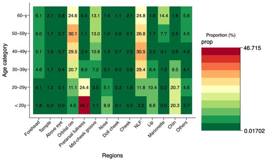 Odds ratio analysis of injection site selection by age group, using the “under 20 years” group as a reference (Reference = 1). The heatmap visualizes the relative likelihood of treating specific areas as age increases. The odds ratios for orbital rim and mid-cheek groove injections increase progressively, peaking in the 40s and 50s. Notably, the odds ratio for marionette line treatments shows a sharp, non-linear rise in patients over 40 (p < 0.05), indicating that this area becomes a distinct priority for mature patients.