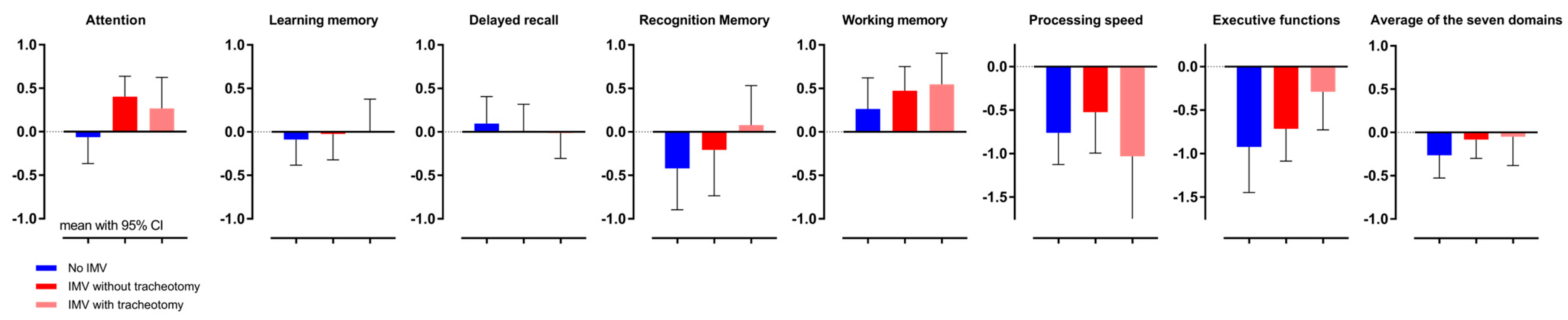 3.4.2. CogPerf per Domain: IMV Days, Moderators Age, Cognitive Reserve