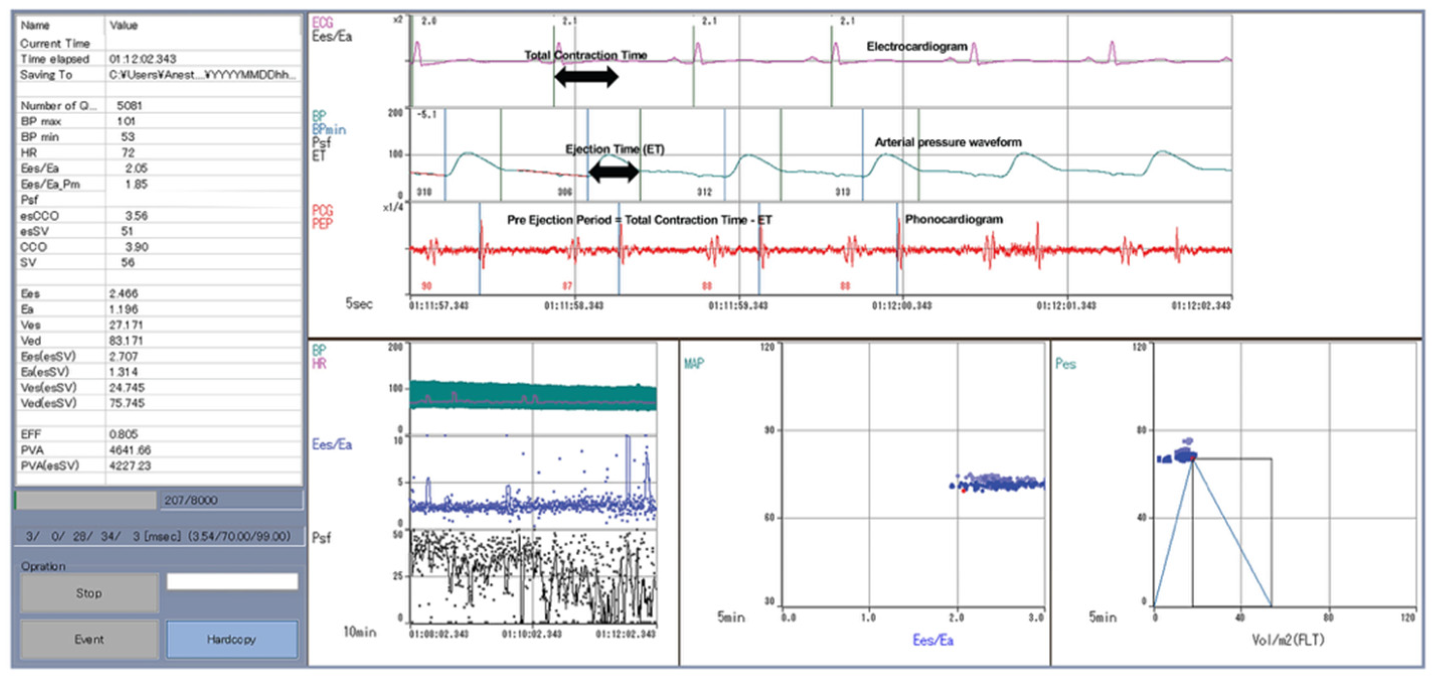 To overcome this limitation, we developed a less invasive method for estimating left ventricular preload, afterload, and heart contractility, which would otherwise require TEE or a Swan–Ganz catheter. This method combines electrocardiogram, arterial pressure waveform, and phonocardiogram data. Phonocardiogram results are obtained using an orally inserted esophageal stethoscope. From these signals, the pre-ejection period (PEP) and ejection time (ET) can be derived, which, together with Hayashi’s method, enable calculation of left ventricular–arterial coupling (Ees/Ea) [