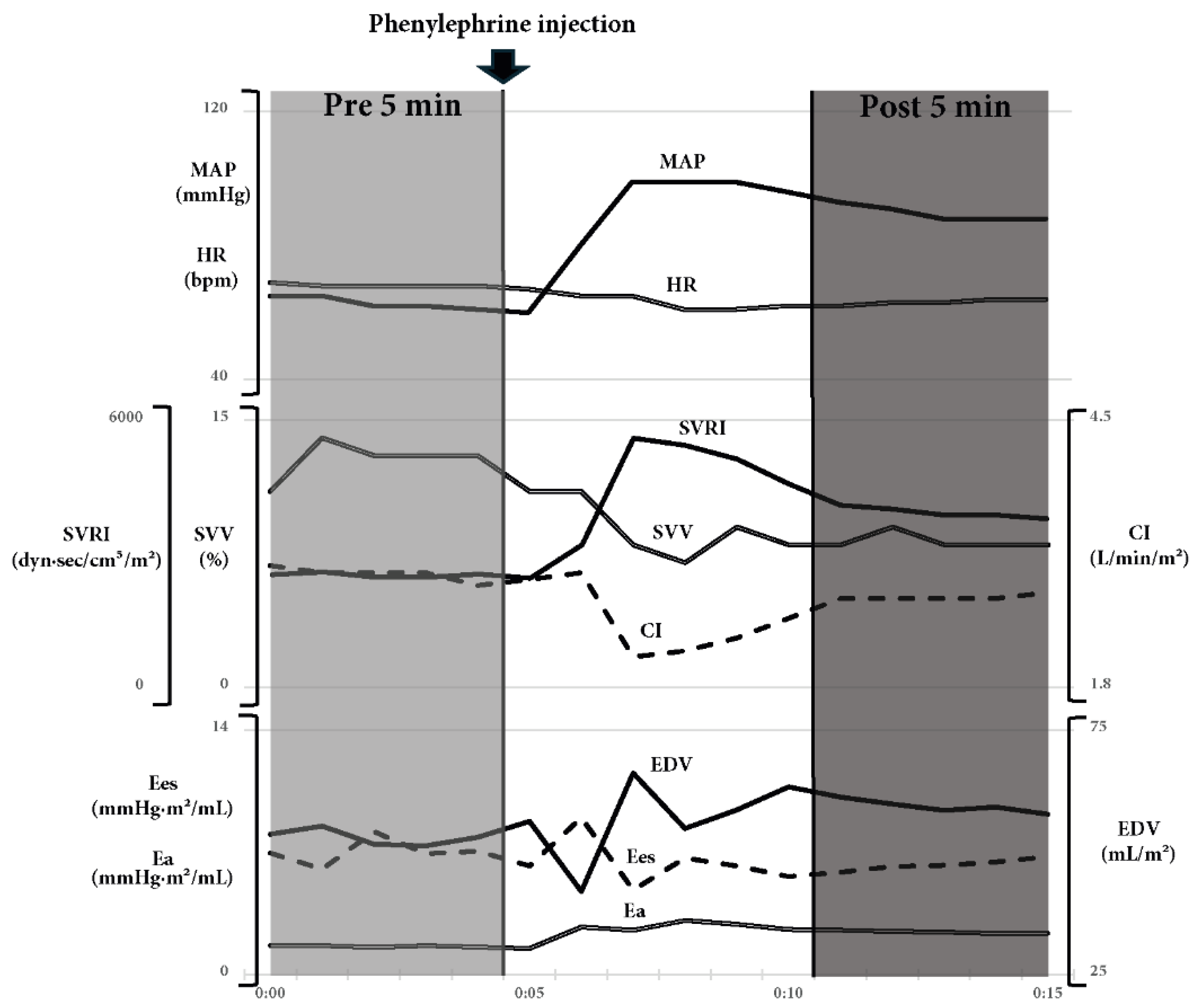 8]. Therefore, 5 min after administration is considered a time when the effect is fully manifested. Furthermore, 5 to 10 min after administration was considered the time when the effect of phenylephrine was maximal. At these two time points, eight parameters were analyzed: heart rate (HR), MAP, SVV, SVRI, CI, EDV, Ea, and Ees.