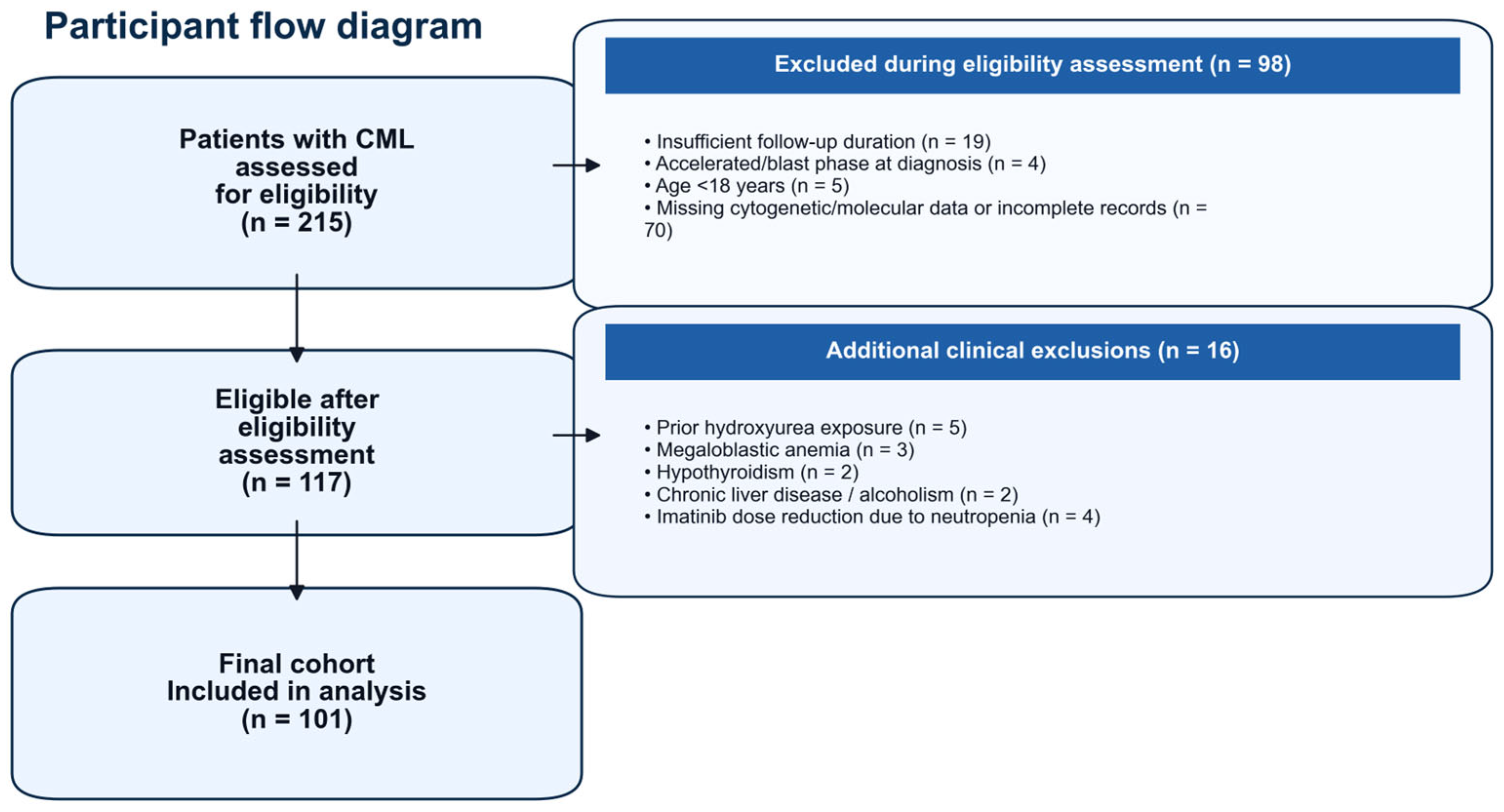 Following eligibility assessment, additional clinical exclusion criteria were applied, including prior exposure to hydroxyurea (n = 5), megaloblastic anemia (n = 3), hypothyroidism (n = 2), chronic liver disease or alcoholism (n = 2), and imatinib dose reduction due to neutropenia (n = 4). In all dose-reduced cases, imatinib was reduced to 300 mg/day due to neutropenia.
