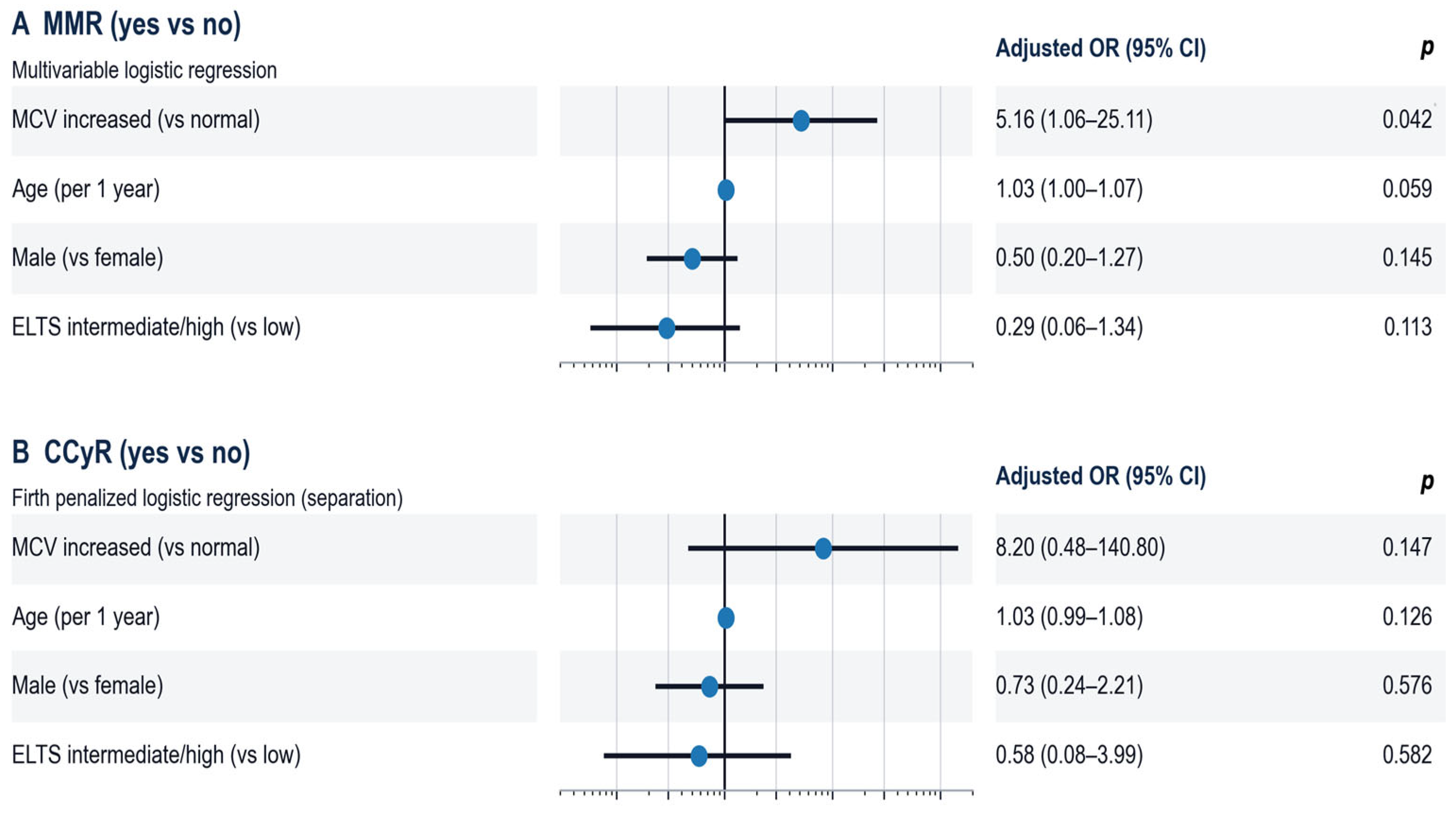 p = 0.042). For CCyR at 12 months, standard logistic regression was not appropriate due to complete separation (there were no patients who did not achieve CCyR in the increased MCV group); therefore, Firth penalized logistic regression was applied, showing a positive but non-significant association (OR 8.20, 95% CI 0.48–140.80;
