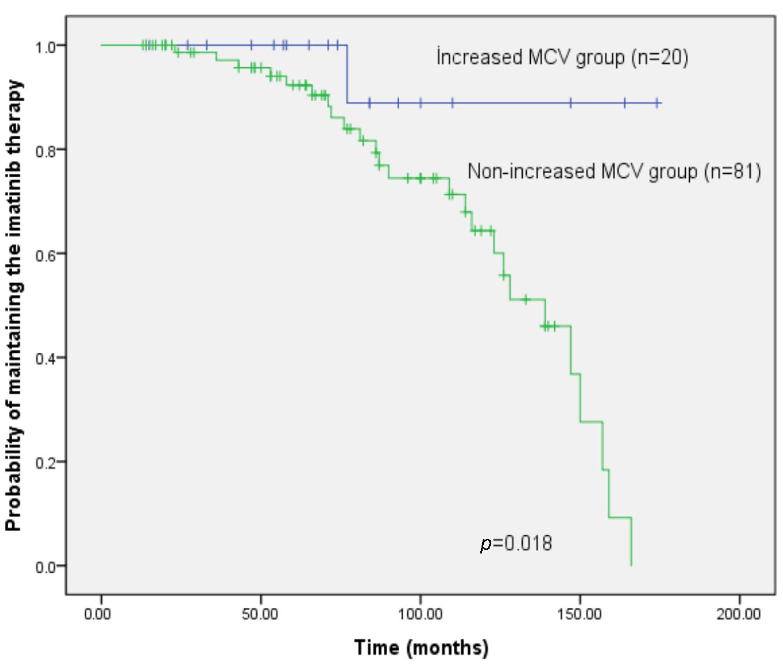 p = 0.018). Imatinib was discontinued in only 1 of the 20 patients with increased MCV due to loss of CCyR, whereas 25 of the 81 patients in the normal MCV group required a switch to second-generation tyrosine kinase inhibitors because CCyR was not achieved at 12 months or was later lost during follow-up (