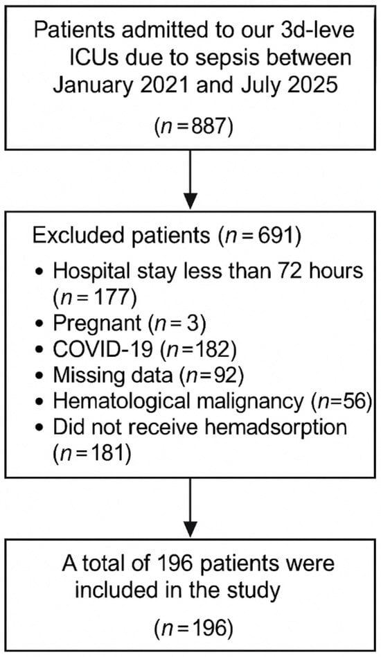 Between January 2021 and July 2025, 887 patients were admitted to our third-level ICUs with sepsis. We excluded 177 patients with hospital stays less than 72 h, 3 patients due to pregnancy, 182 patients with COVID-19, 92 patients due to missing data, 56 patients with hematological malignancy, and 181 patients who did not undergo hemadsorption. A total of 196 patients were included in the study (Figure 1).