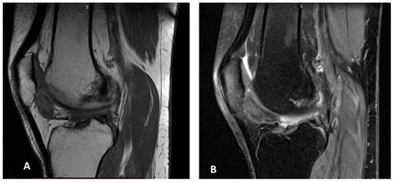 MRI of the right knee revealed a similar mass-like lesion in the posterior compartment, measuring 19 × 11 × 20 mm, accompanied by mild joint effusion. The signal characteristics on both T2 fat-saturated and T1-weighted images mirrored those of the left knee (Figure 2A,B).