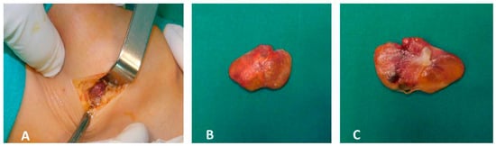 Intraoperative photographs (A–C). Intraoperative findings following open arthrotomy and marginal resection of the localized lesions in both knees. The excised specimens exhibit a yellow-brown coloration and irregular, lobulated surface.