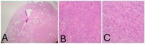 The patient underwent open arthrotomy with marginal excision of the localized lesions in both knees. Grossly, the excised specimens were yellow-brown in color and exhibited an irregular, lobulated surface (Figure 3A–C).