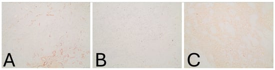 Immunohistochemistry (IHC) staining (A–C). Immunohistochemistry (IHC) staining of tumor cells showing negativity for (A) SMA (×100). (Β) Low proliferative activity with Ki-67 labeling index of approximately 1% (×100). (C) Diffuse cytoplasmic immunoreactivity of tumor cells for PGM-1 (×100).
