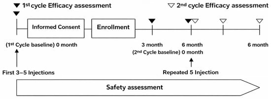 In the repeated-treatment subgroup (n = 45), a second PN cycle was administered using the same procedure after a mean interval of 191 ± 42 days following completion of the first cycle. The second cycle consisted of five weekly injections, with outcome assessments repeated at the second-cycle baseline and at 3 and 6 months thereafter.