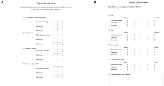 Patients completed a questionnaire (Figure 2B) to assess their experience with each device (pen-shaped otoscope, endoscope, and microscope). They rated pain and fear on a 5-point scale ranging from 1 (none) to 5 (severe), and image quality and understanding of their condition from 1 (good) to 5 (poor). A free-text section was also included to allow for additional comments.