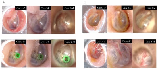 Comparison of the pen-shaped otoscope (P), endoscope (E), and microscope (M). All images are from the right ear. (A) Cases with good visualization: Case 1. Postoperative tympanic membrane findings following surgery for pars flaccida cholesteatoma. Case 2. Tympanic membrane after placement of a tympanic ventilation tube. (B) Cases where the pen-shaped otoscope was at a disadvantage: Case 3. Overhang of the anterior and inferior walls of the external auditory canal. Case 4. Presence of hair in the external auditory canal.