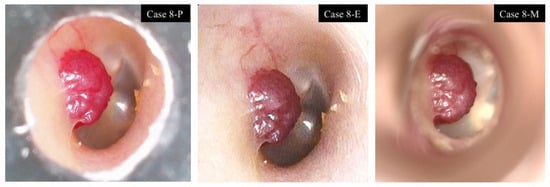 Case 1 shows a postoperative ear following surgery for pars flaccida cholesteatoma, in which the scutum was reconstructed with cartilage. Case 2 demonstrates the tympanic membrane after placement of a tympanic ventilation tube. In Case 1, all key tympanic membrane structures were clearly visualized using all devices, whereas in Case 2, all key structures were clearly visualized with the pen-shaped otoscope and the endoscope, but not with the microscope.