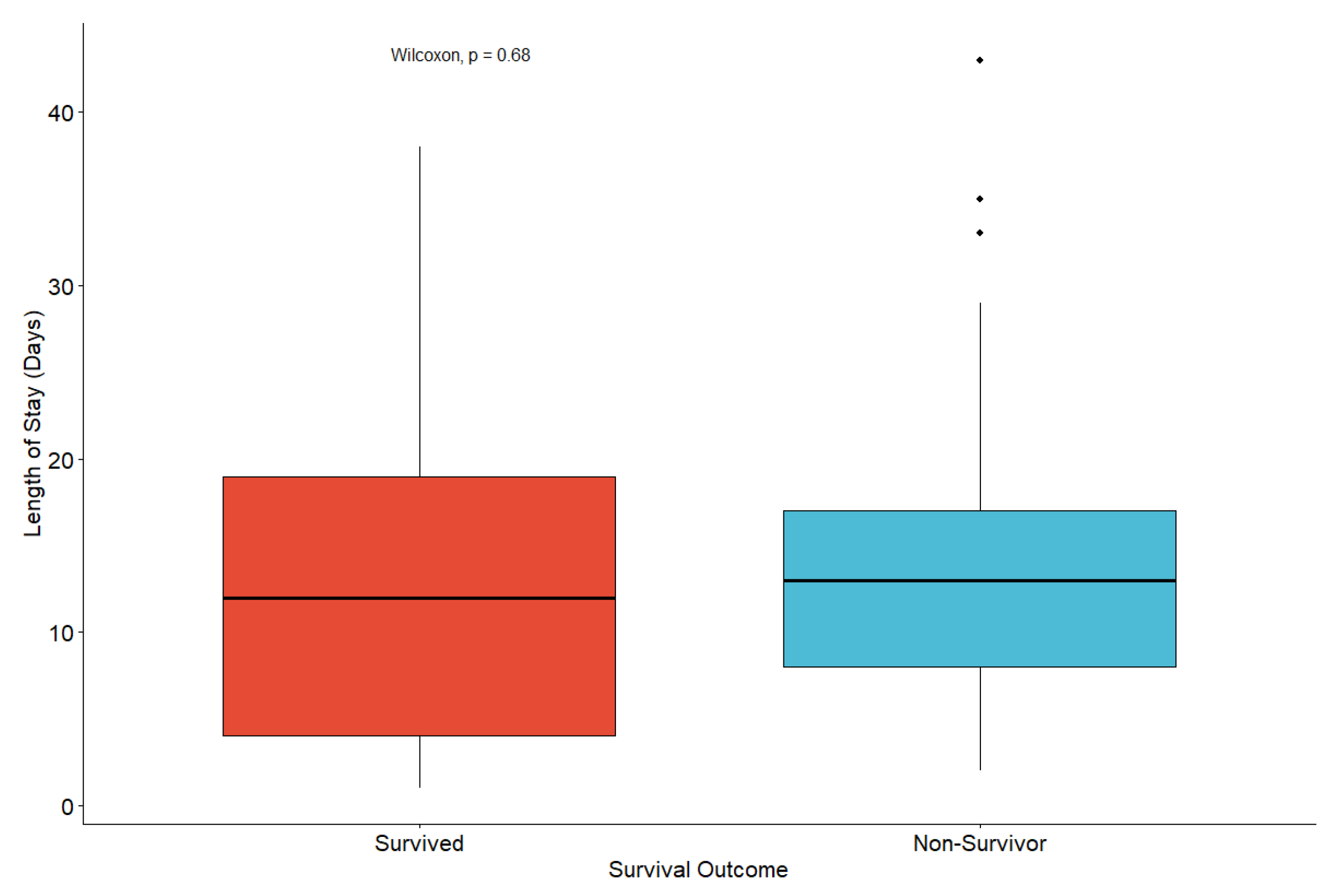 | Length of Stay (days) | 12 (4, 19) | 13 (8, 17) | 0.7 |
