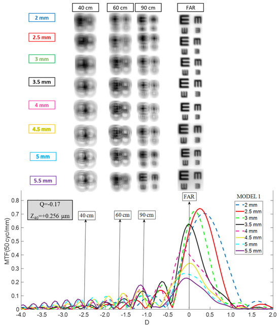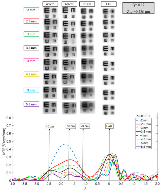 Pupil size dependence of the RayOne TO MTF curve considering Model 1. Simulated optotypes are shown for all pupil sizes and distances.