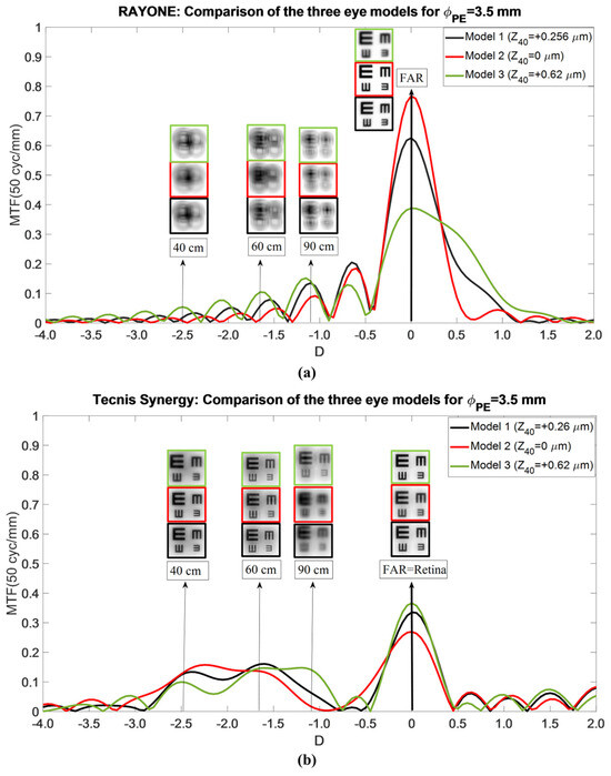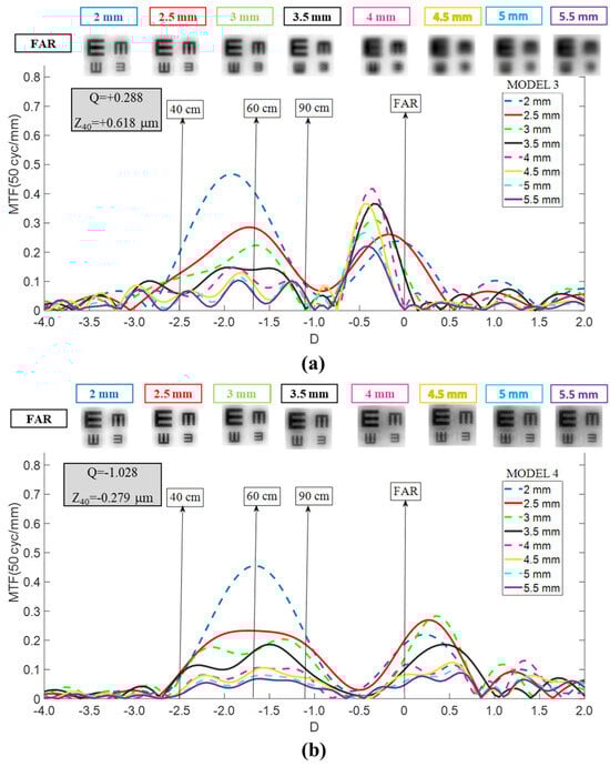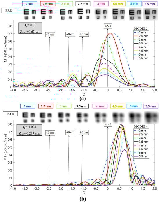 Dependency of the RayOne TO MTF curves on pupil size for Models 2 (a) and 3 (b). Simulated optotypes for far vision and all pupil sizes are shown.