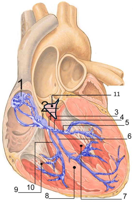 Cardiac conduction system by J. Heuser, licensed under CC BY 2.5/Wikimedia Commons. URL: https://commons.wikimedia.org/w/index.php?title=File:RLS_12blauLeg.png&oldid=971131153 (accessed on 10 December 2025). 1. Sinoatrial node; 2. Atrioventricular node; 3. Bundle of His; 4. Left bundle branch; 5. Left posterior fascicle; 6. Left-anterior fascicle; 7. Left ventricle; 8. Ventricular septum; 9. Right ventricle; 10. Right bundle branch; 11. Membranous septum.