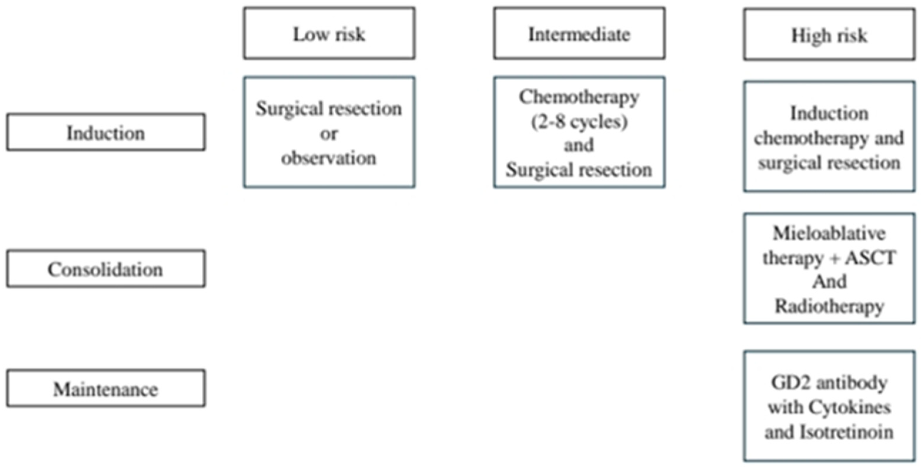 Management of high-risk neuroblastoma follows a multimodal, sequential approach consisting of three main therapeutic phases. The induction phase involves intensive multi-agent chemotherapy, often combined with surgical resection of the primary tumor, with the aim of achieving maximal tumor cytoreduction. This is followed by a consolidation phase, which includes high-dose myeloablative chemotherapy supported by autologous stem cell transplantation (ASCT) and locoregional radiotherapy to eradicate residual disease. Finally, the maintenance phase is designed to eliminate minimal residual disease and reduce relapse risk, typically employing differentiation therapy with isotretinoin in combination with immunotherapeutic agents targeting tumor-associated antigens, such as anti-GD2 monoclonal antibodies [