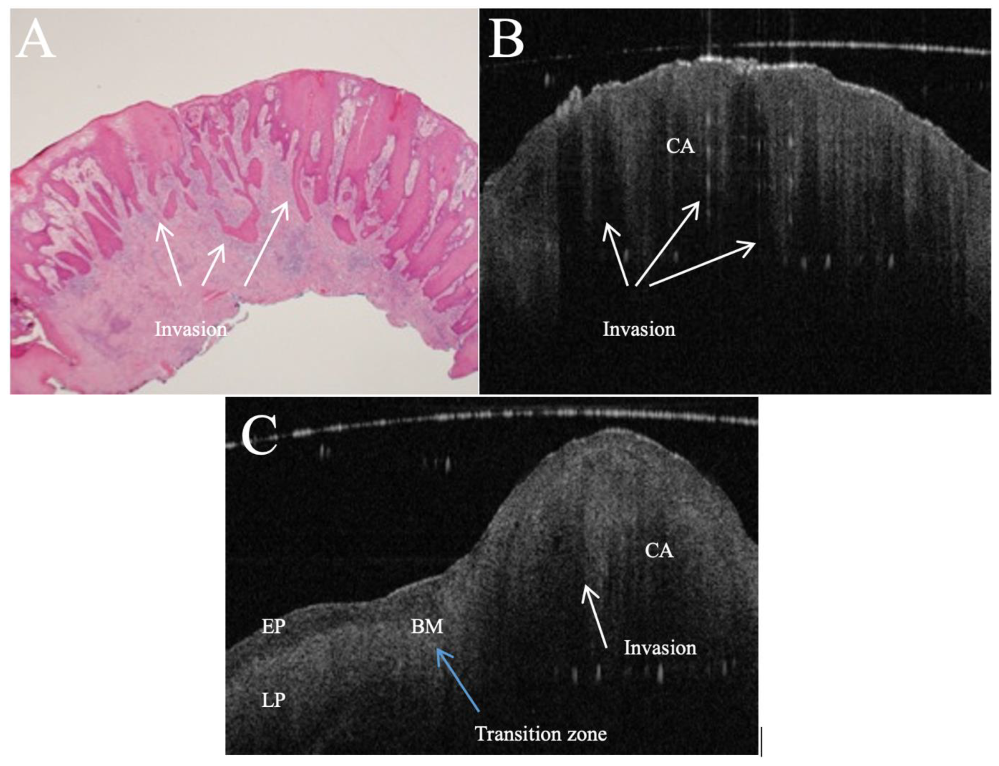 Prior studies have demonstrated that OCT can detect dysplastic change and help distinguish benign from malignant mucosal lesions. Reported optical biomarkers include epithelial thickening, increased scattering, loss of stratification, and disruption or loss of the BM, with several studies showing correlation between OCT appearance and histopathological features of malignancy [