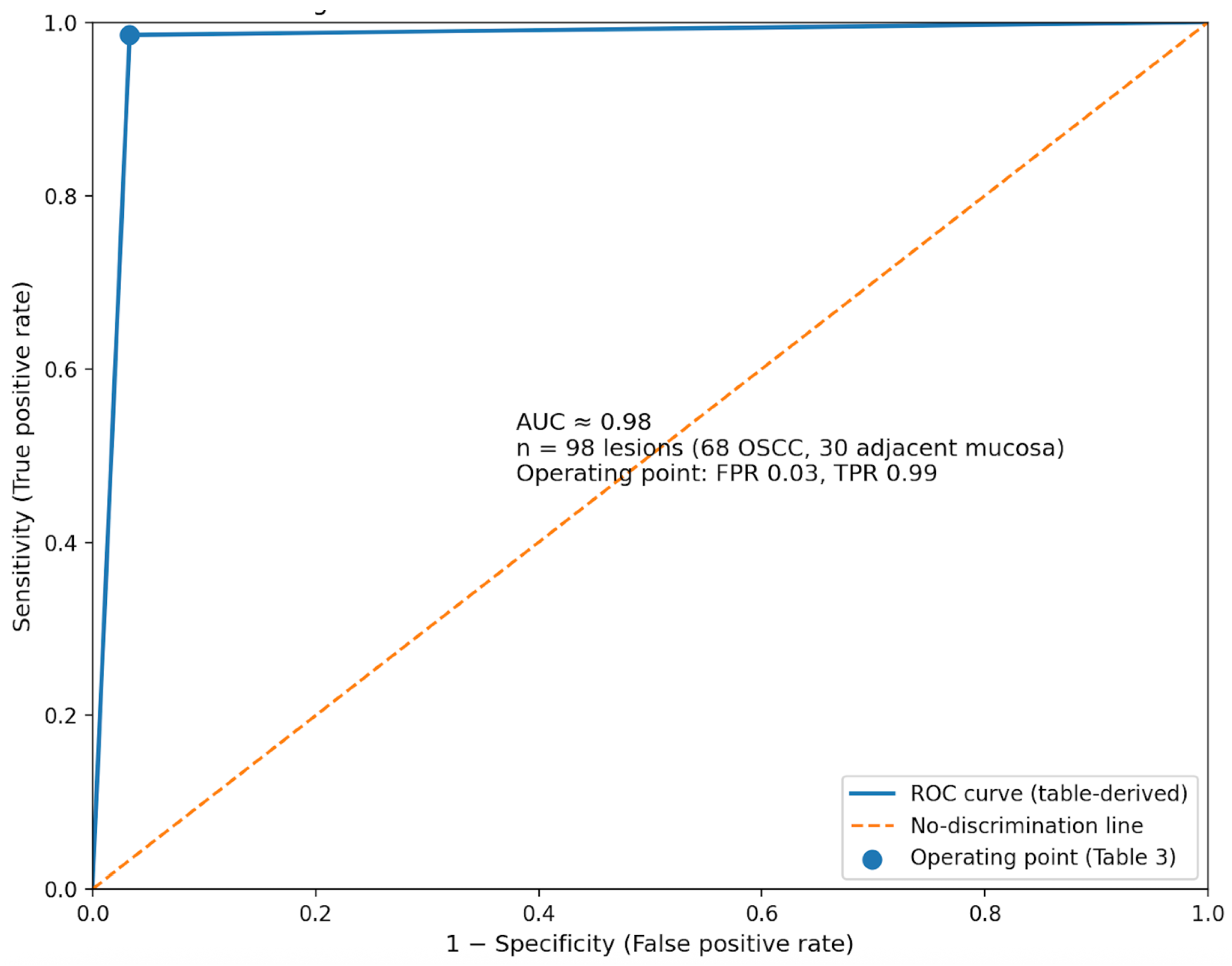 To permit estimation of specificity within the same clinical cohort, histologically negative adjacent mucosa samples were included as comparators. Adjacent mucosa was acquired from clinically normal-appearing tissue adjacent to the primary lesion, scanned within the same visit and confirmed histologically negative. Each patient contributed one OSCC lesion (disease-positive); where adjacent mucosa was available, one comparator sample per patient was included. The diagnostic performance dataset therefore comprised 98 lesions/samples (i.e., one representative scan per lesion/sample for analysis): 68 OSCC (disease-positive) and 30 adjacent mucosa samples (disease-negative).