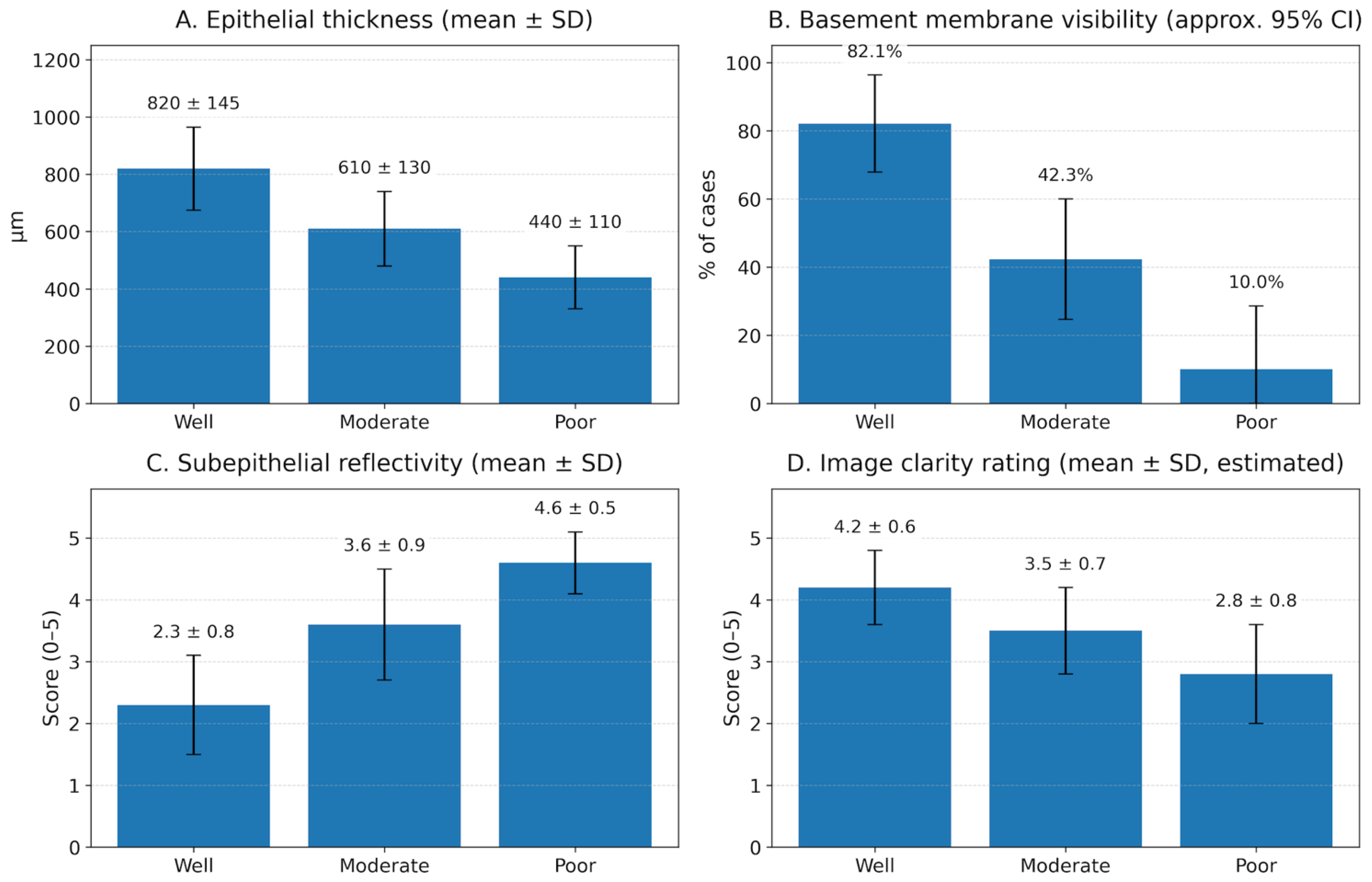 Figure 3). The mean epithelial thickness decreased from 820 ± 145 µm (well-differentiated; n = 28) to 610 ± 130 µm (moderately differentiated; n = 30) and 440 ± 110 µm (poorly differentiated; n = 10). Loss of epithelial stratification increased with worsening differentiation (21.4%, 63.3%, 100%). Basement membrane visibility decreased (82.1%, 42.3%, 10.0%), while basement membrane disruption increased (17.9%, 57.7%, 90.0%). Subepithelial reflectivity increased (2.3 ± 0.8, 3.6 ± 0.9, 4.6 ± 0.5) with higher signal attenuation and reduced tumour–stromal interface clarity (clear in 85.7%, 60.0%, 30.0%, respectively), alongside lower overall image clarity ratings (4.2, 3.5, 2.8). Epithelial thickness on OCT was interpreted as a marker of architectural distortion rather than uniform thickening and may appear reduced in higher-grade tumours due to loss of organised stratified layers and surface ulceration.