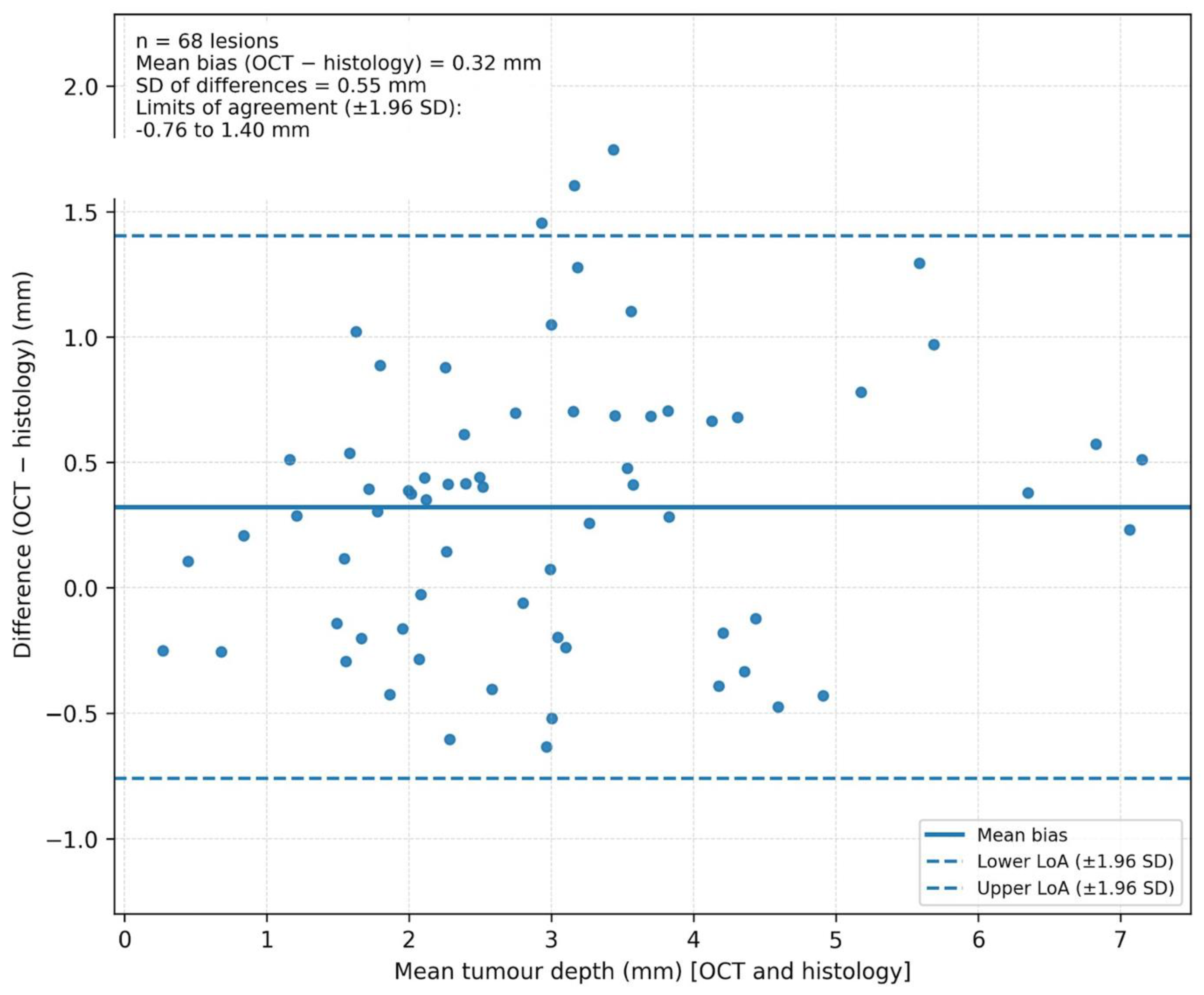 Bland–Altman analysis of tumour depth measurements (n = 68 OSCC lesions) showed a small positive mean bias (OCT−histology) of 0.32 mm (SD of differences 0.55 mm), indicating slight OCT overestimation. The 95% limits of agreement were −0.76 to 1.40 mm (