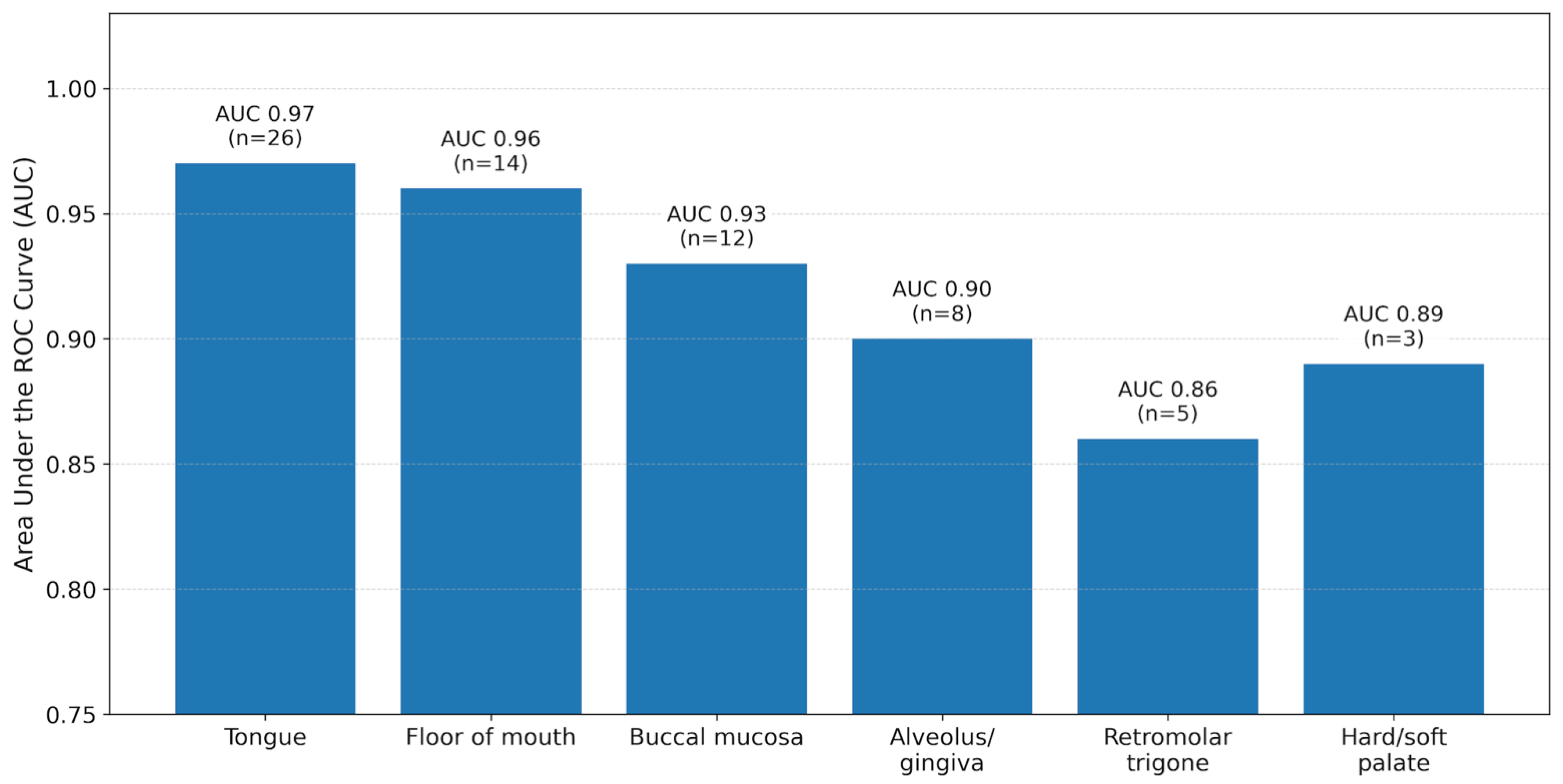 Figure 6). Performance was highest for the tongue (AUC 0.97; 95% CI: 0.92–1.00; n = 26) and the floor of the mouth (AUC 0.96; 95% CI: 0.89–1.00; n = 14), followed by the buccal mucosa (AUC 0.93; 95% CI: 0.83–1.00; n = 12) and alveolus/gingiva (AUC 0.90; 95% CI: 0.75–1.00; n = 8). Lower performance was observed in posterior/keratinised regions, including the retromolar trigone (AUC 0.86; 95% CI: 0.65–1.00; n = 5) and hard/soft palate (AUC 0.89; 95% CI: 0.64–1.00; n = 3).