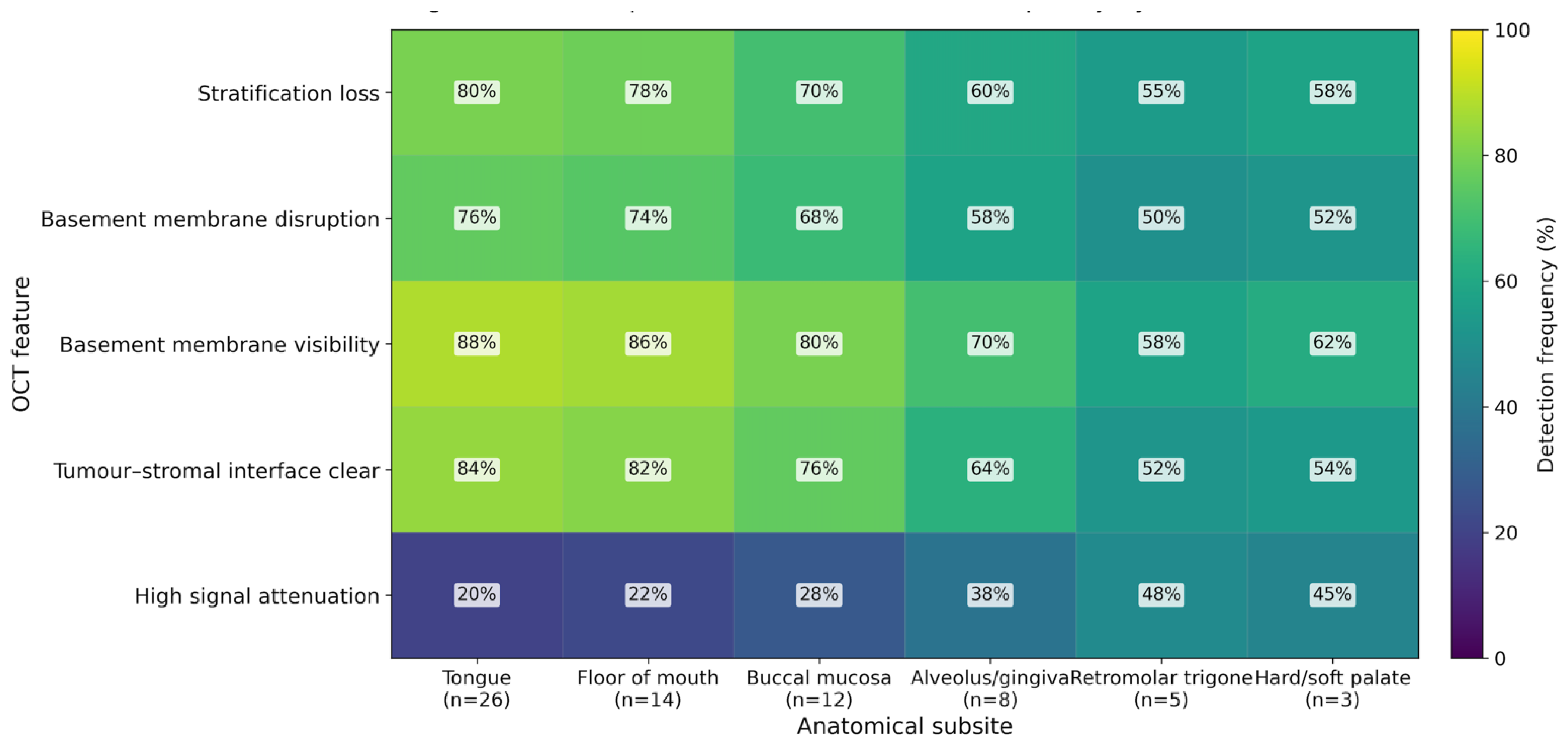 Figure 6), with higher detection of stratification loss, basement membrane visibility/disruption, and a clear tumour–stromal interface in anterior subsites and increased signal attenuation in posterior/keratinised subsites, which reduced confidence in feature detection and lesion classification. Given the small numbers in some posterior subsites (notably palate and retromolar trigone), subsite comparisons were interpreted descriptively and were not subjected to formal hypothesis testing.