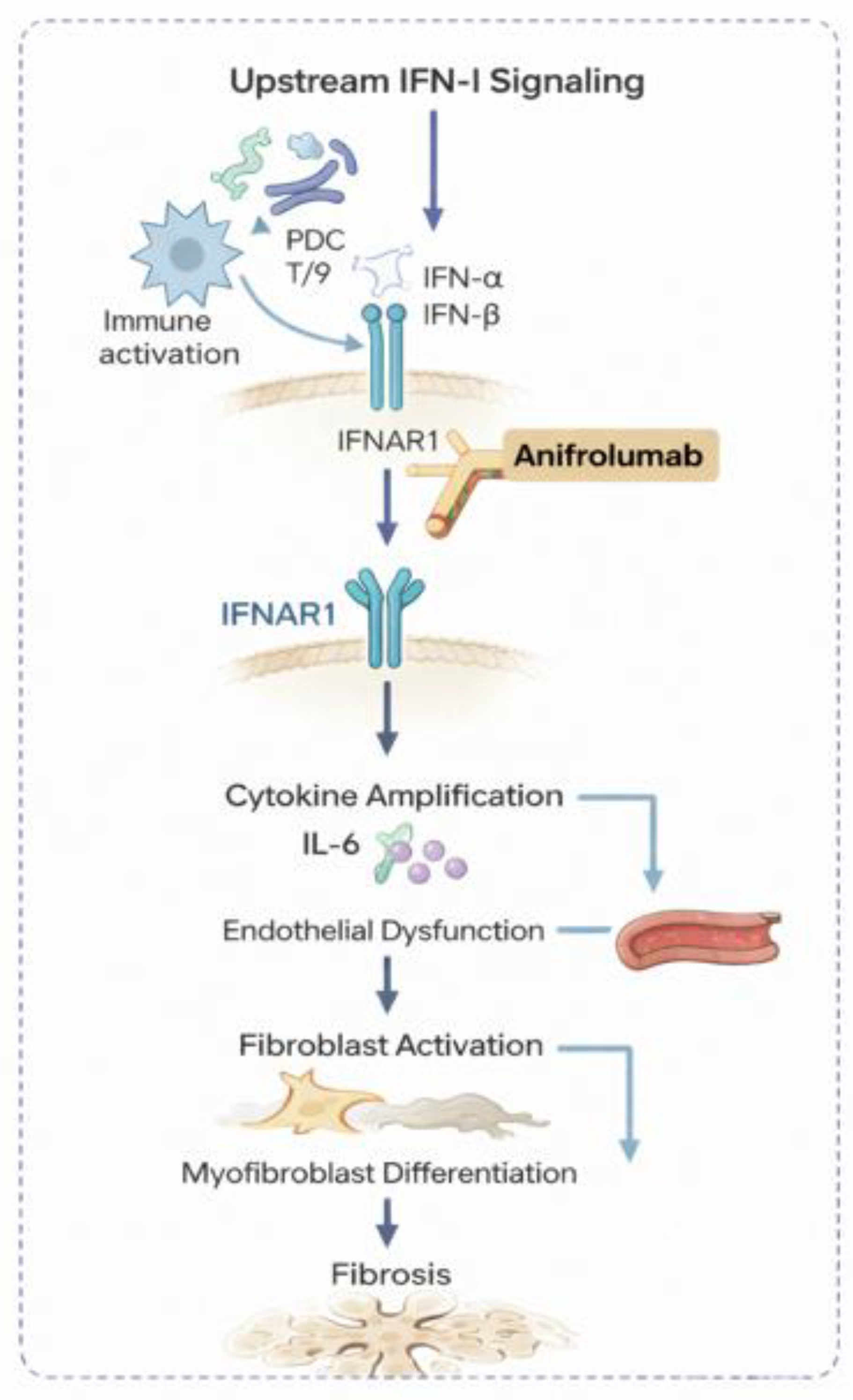| MEDI-546 Phase I [54] | Systemic sclerosis (n = 34) | Phase I, multicenter, open-label, dose-escalation | Intravenous MEDI-546 (single and multiple ascending doses) | Dose-dependent suppression of interferon-regulated gene expression; confirmed pharmacodynamic target engagement | Generally well tolerated; upper respiratory tract infections were most frequently reported |