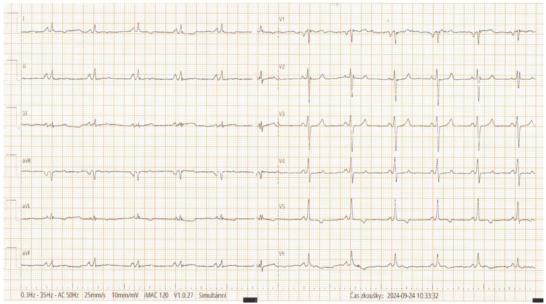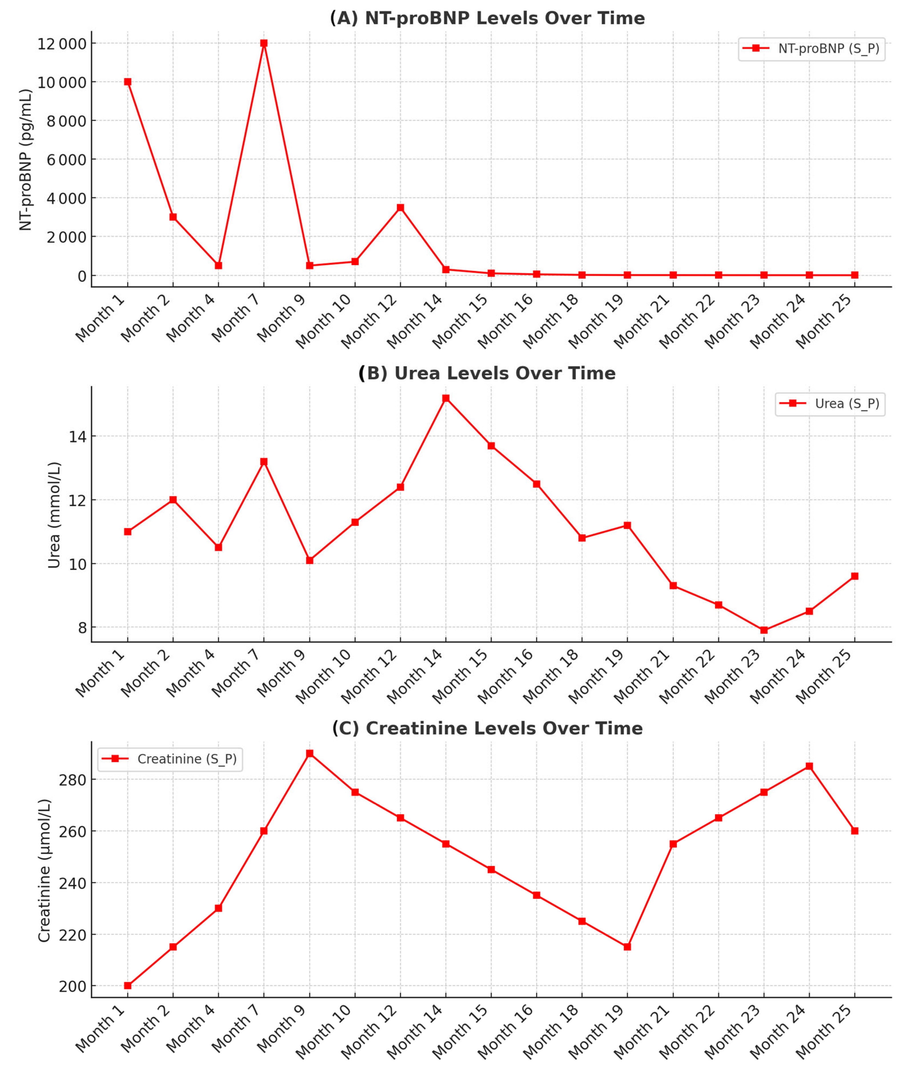 | Admission (Day 0) | Hypotension, tachycardia; HF decompensation; lactate mildly elevated | ECG, labs incl NT-proBNP, TTE | IV diuretics/vasoactive support (as applicable) |