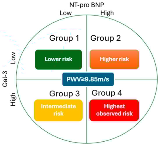 In summary, long-term mortality in this HD cohort was primarily driven by markers of myocardial stress and arterial stiffness, namely NT-proBNP and PWV. In contrast, gal-3 did not retain independent prognostic value over extended follow-up. Although biomarker-defined differences in survival were observed, no significant associations were identified between biomarker profiles and three-point MACE. Figure 2 illustrates the four biomarker-defined groups based on baseline NT-proBNP and galectin-3 levels, with colors indicating relative long-term mortality risk within the study population rather than absolute clinical thresholds.